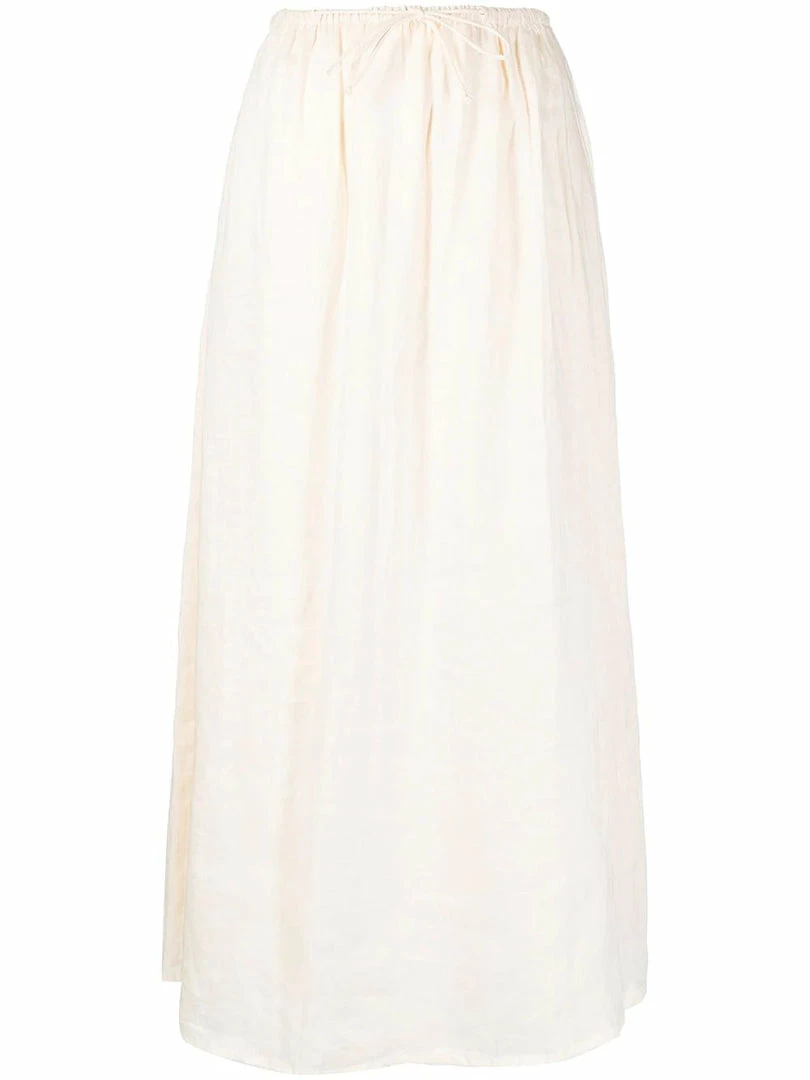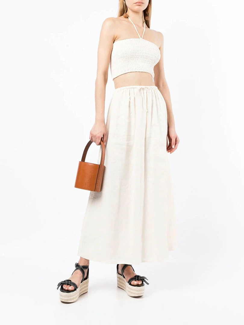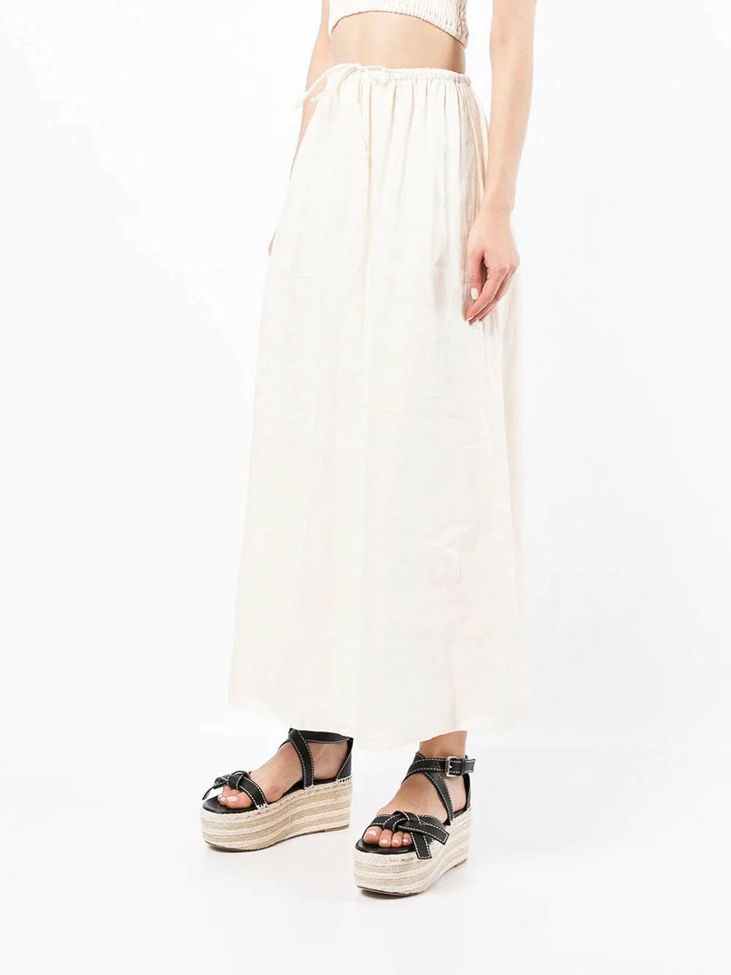 Faithfull The Brand cream ‘Jovianne’ midaxi skirt featuring an elasticated drawstring waistband, a long midi length and pulls on. Item fits true to size. Model is wearing a size S.Â