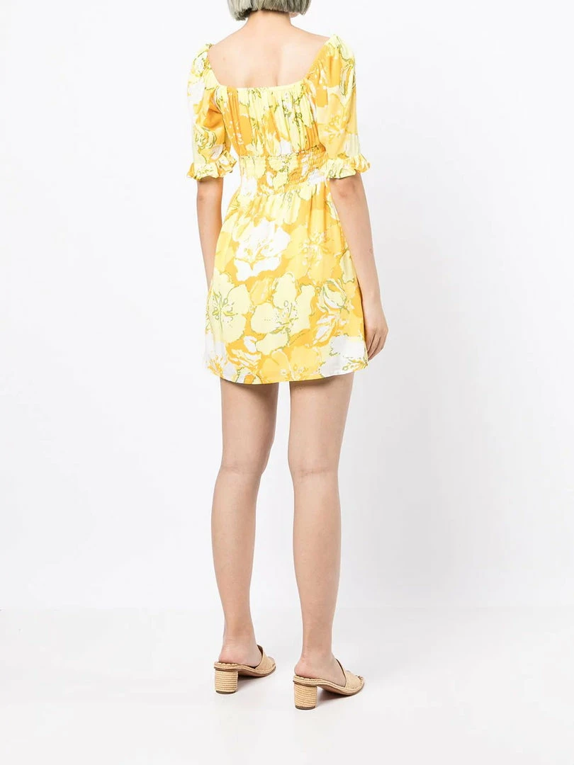 Faithfull The Brand ‘Lecco’ floral mini dress featuring an elasticated square neckline with a front tie detail, short sleeves with ruffled cuffs, a shirred waist, a side zip fastening, a yellow and orange oversized floral print and a short length. Item fits true to size. Model is wearing a size S.Â