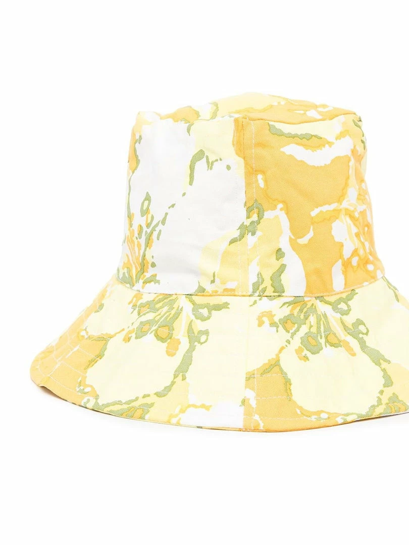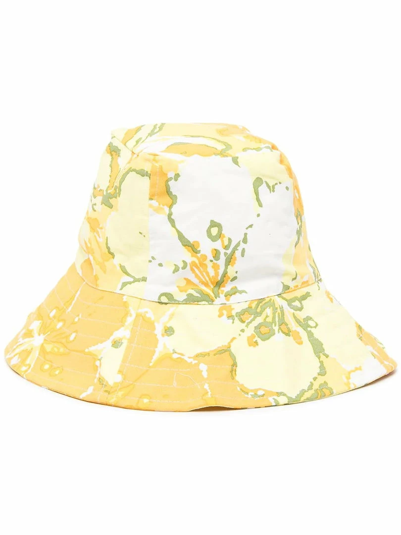 Faithfull The Brand ‘Loli’ floral bucket hat featuring a round top, a wide brim, a yellow and orange oversized floral print and pulls on. Item is One Size. Made in Indonesia.