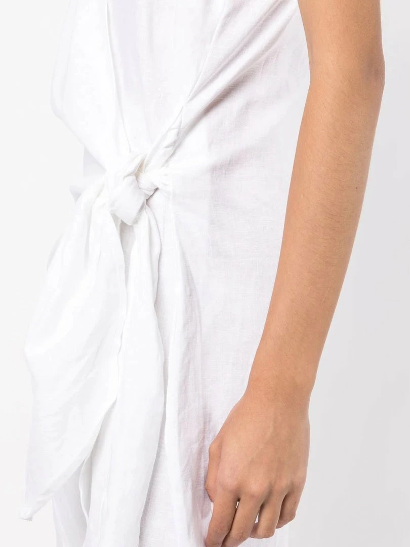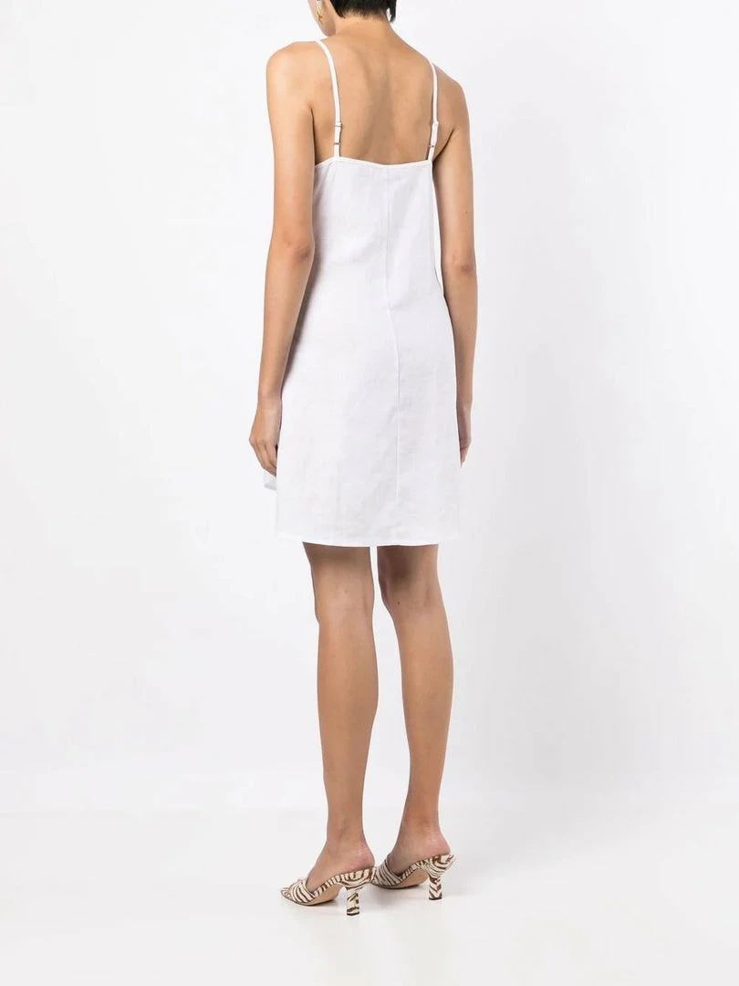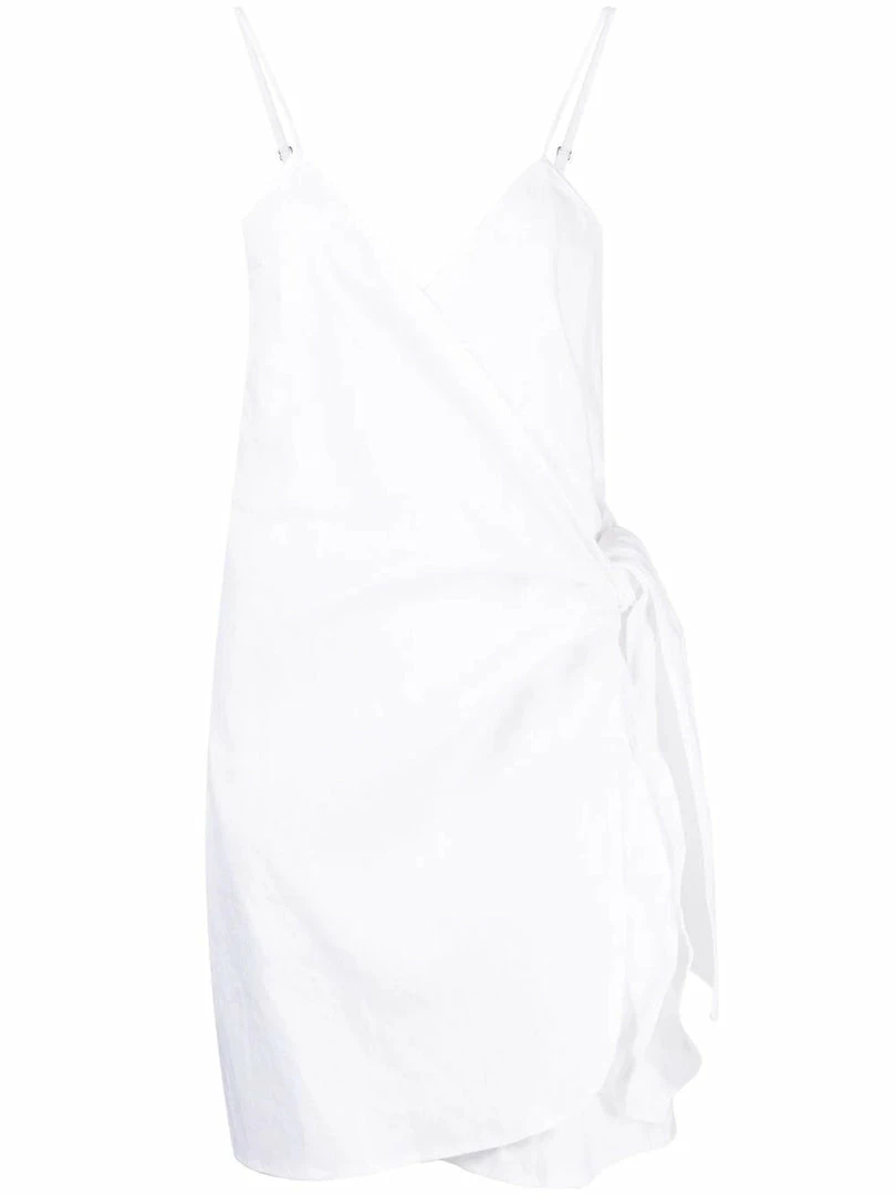 Faithfull The Brand white ‘Avery’ wrap dress featuring a v-neckline, adjustable spaghetti straps, a wrap tie fastening and a short length. Item fits true to size. Model is wearing a size S.Â