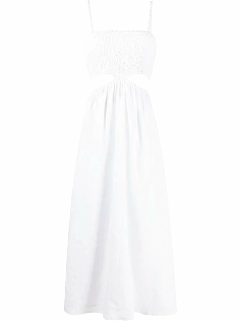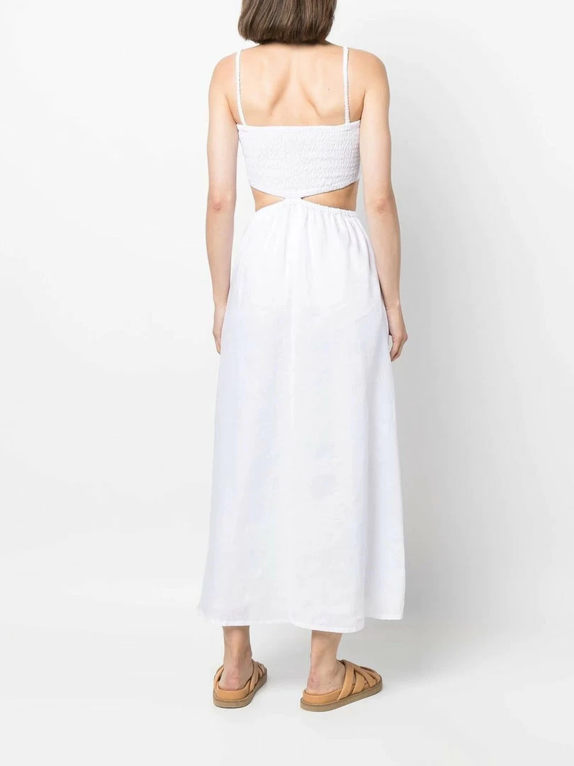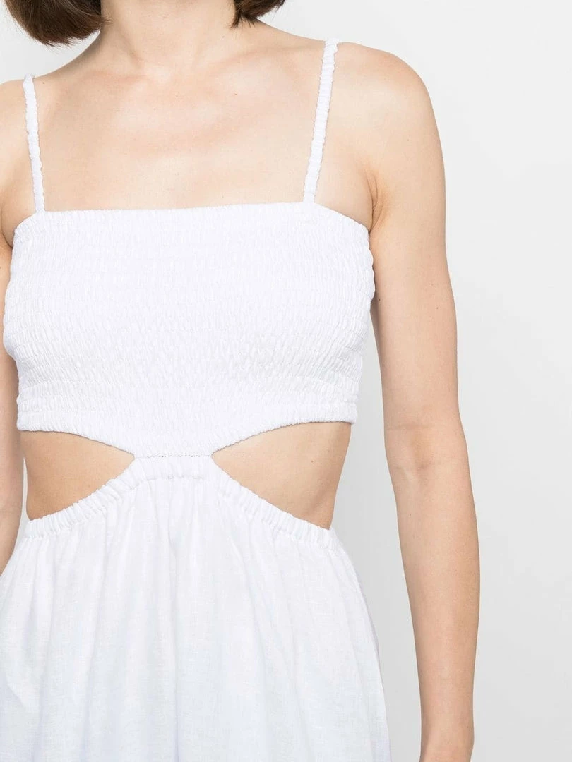 Faithfull The Brand white ‘Tayari’ midi dress featuring thin elasticated shoulder straps, a shirred bodice, side cut out details and a pull on style. Item fits true to size. Model is wearing a size S.