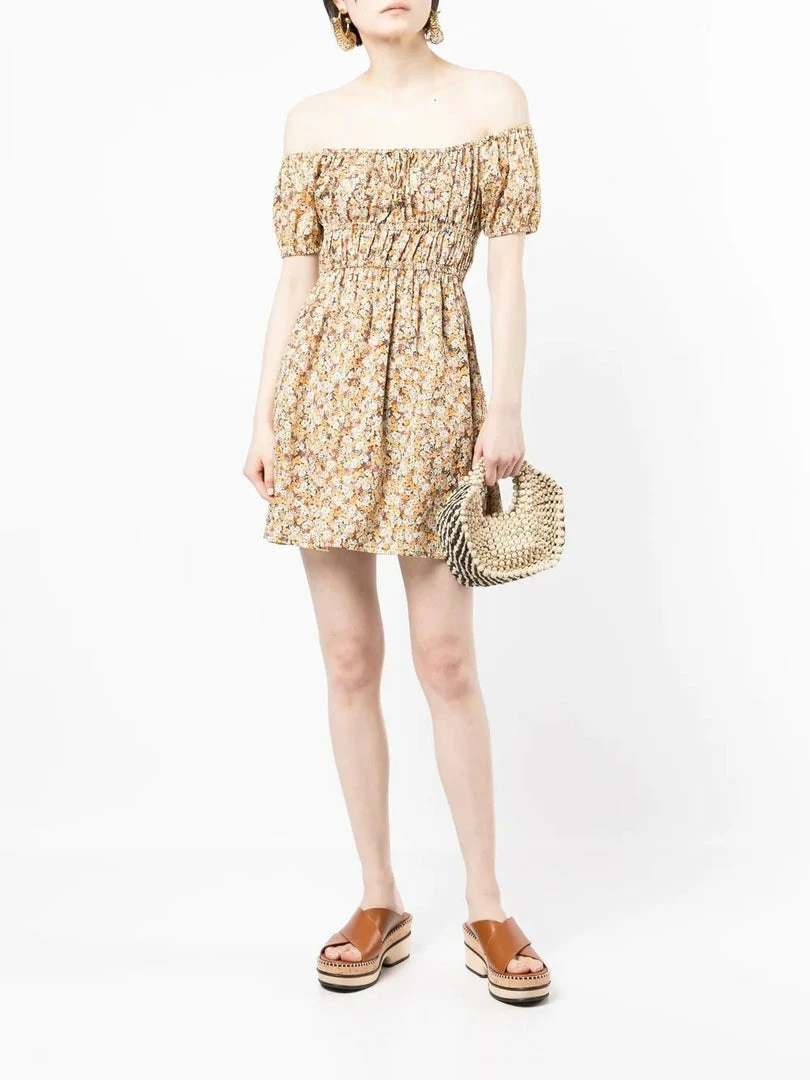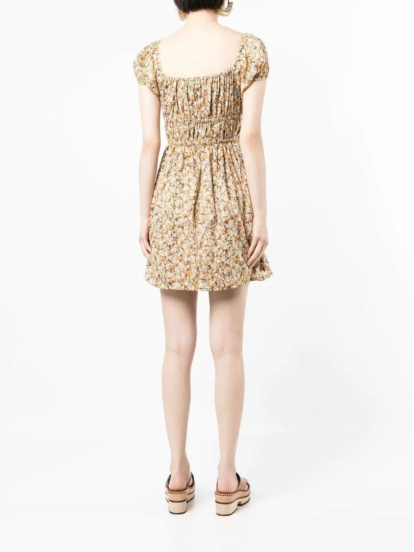 Faithfull The Brand ‘Viola’ mini dress featuring an elasticated neckline with a front keyhole design and tie fastening, short sleeves with elasticated cuffs, an elasticated waist detail, a brown and yellow toned floral print and pulls on. Item fits true to size. Model is wearing a size S.