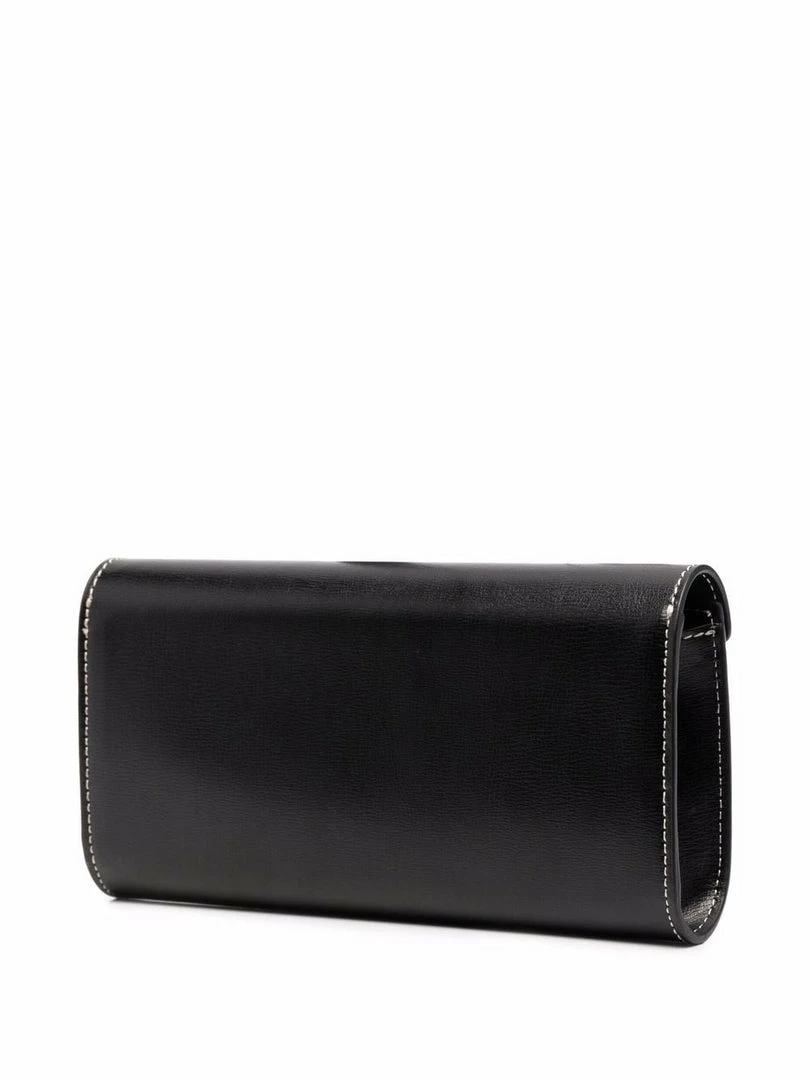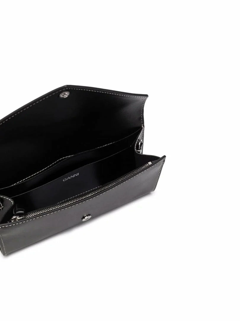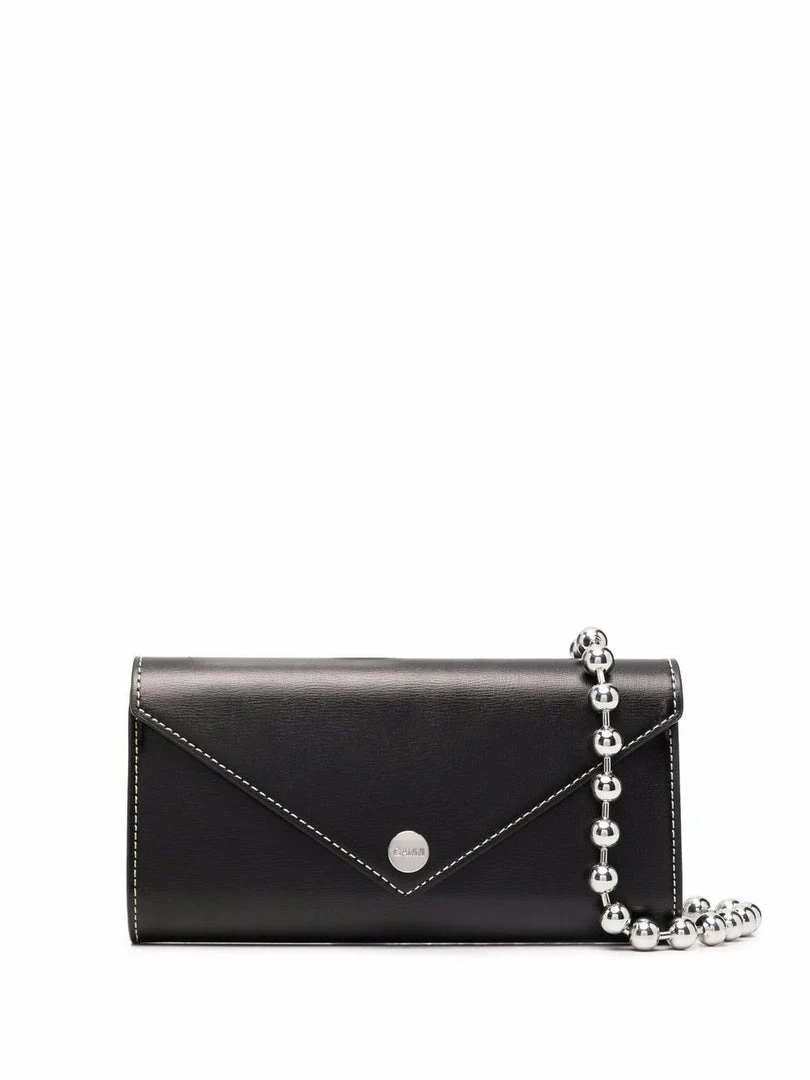 Ganni black ‘Bauble Chain Mini Handbag’ featuring a detachable silver tone bauble chain strap, an envelope style snap button closure, inner side compartments and contrasting white stitching. Item is One Size. Made in China.Â