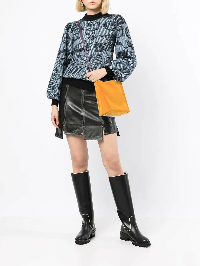 Ganni blue ‘Logo Smiley Balloon Sleeve Sweater’ featuring a crew neckline, long balloon sleeves, a black brand logo and smiley face print, a ribbed knit and pulls on. Item fits true to size. Model is wearing a size XS.Â