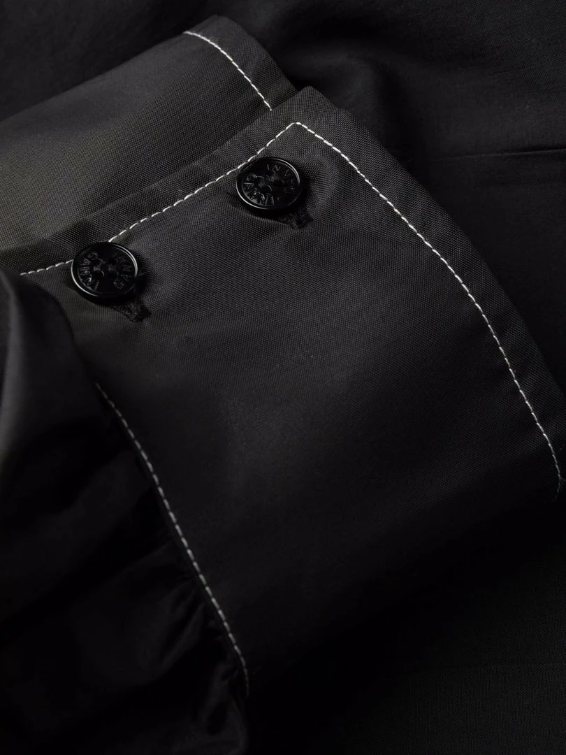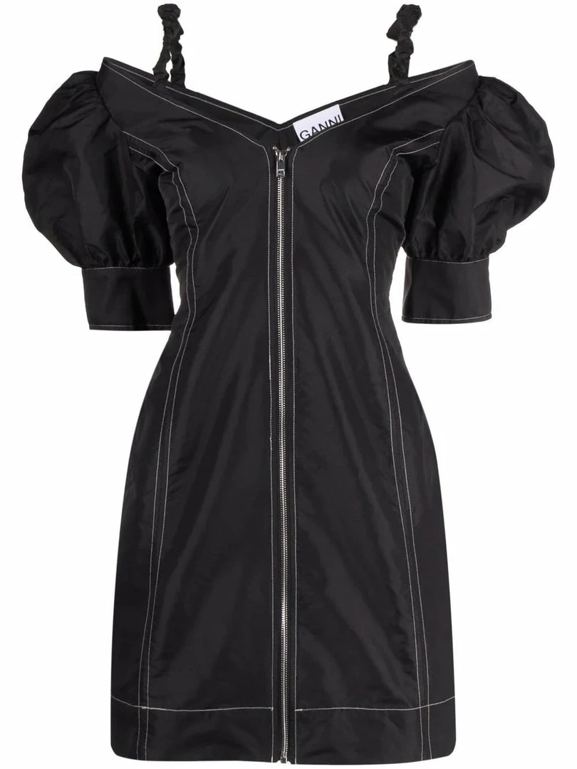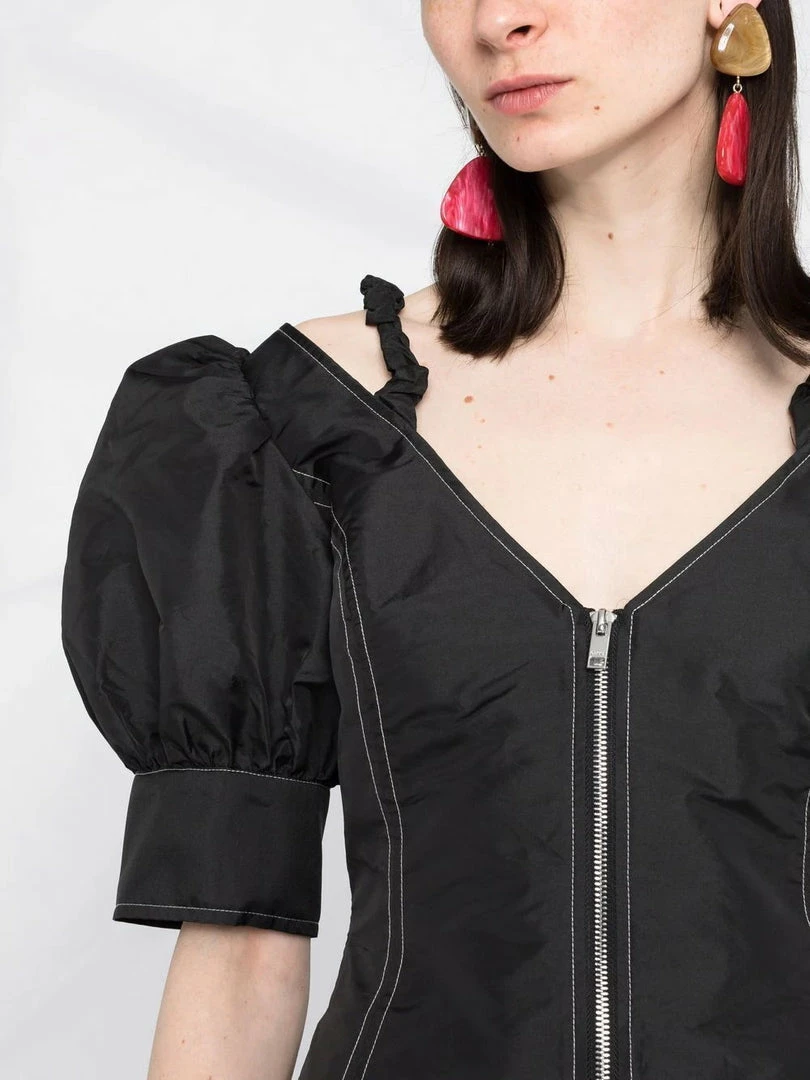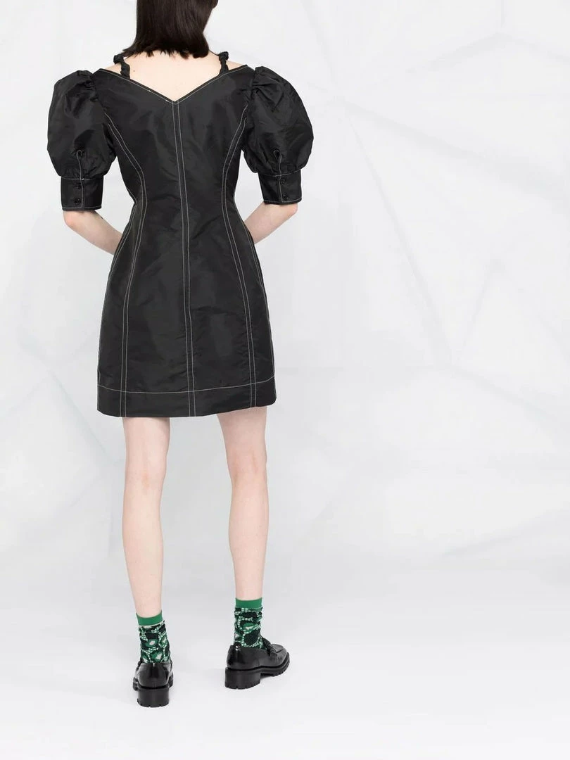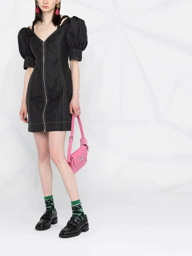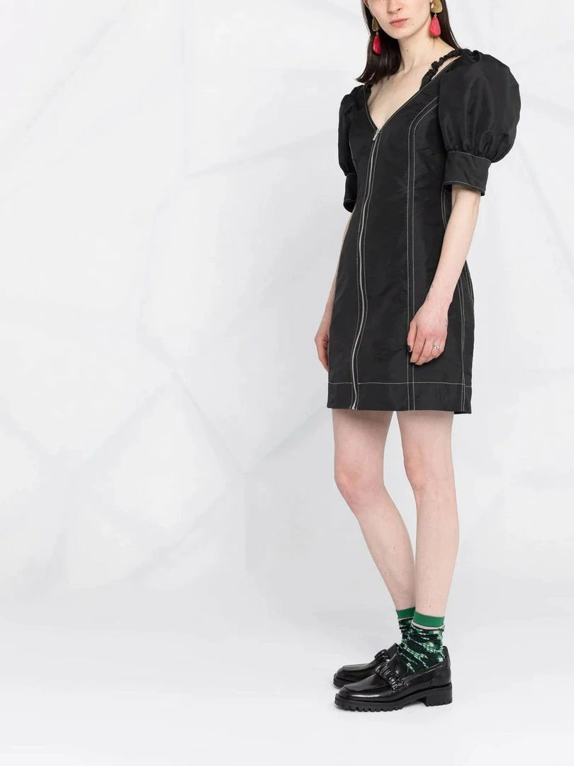 Ganni black ‘Contrasting Stitched Puff Sleeve Mini Dress’ featuring a V-neck and backline, thin ruched shoulder straps, short puffed sleeves with buttoned cuffs, a front zip fastening, contrasting white stitch detailing and a short length. Item fits true to size. Model is wearing a size 36 FR. Â