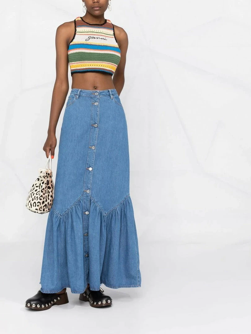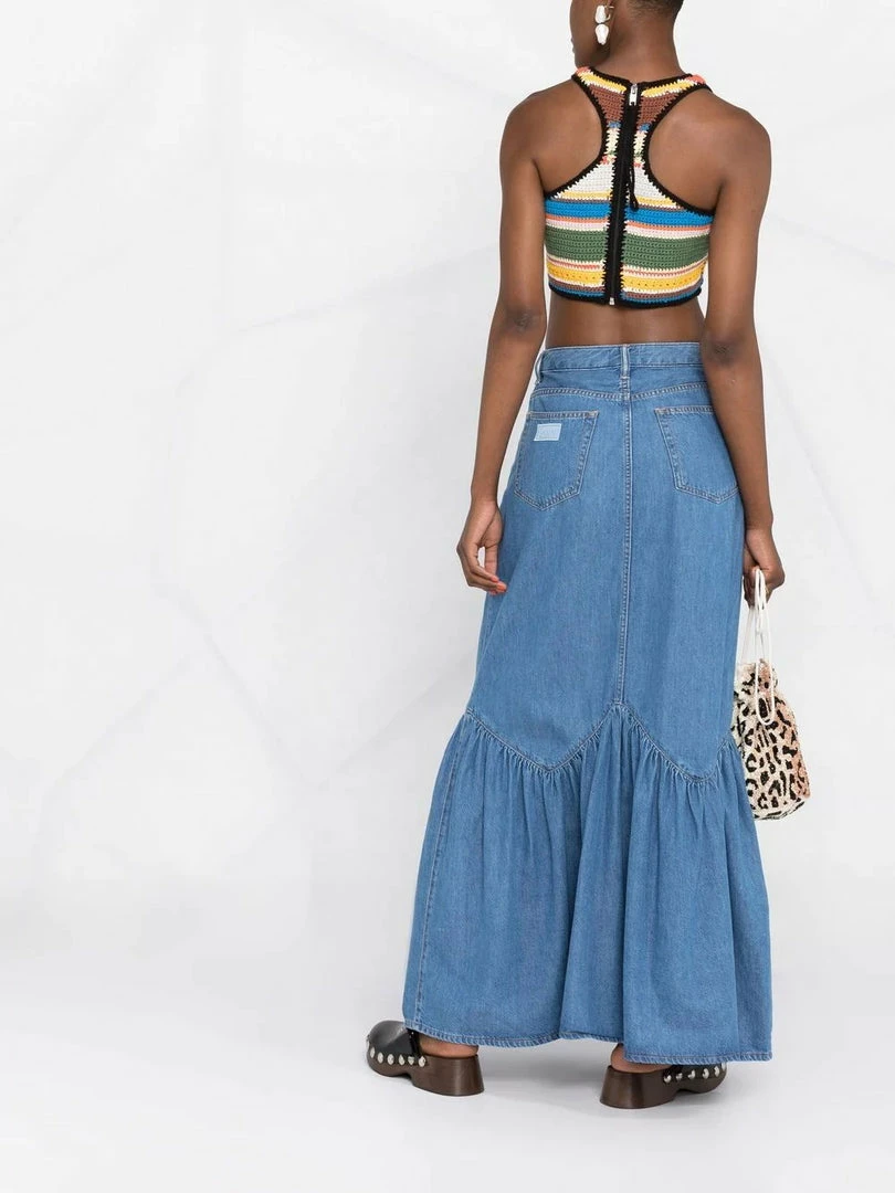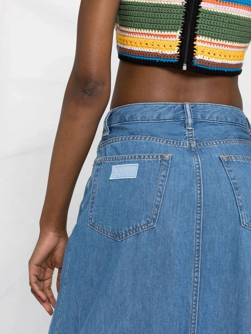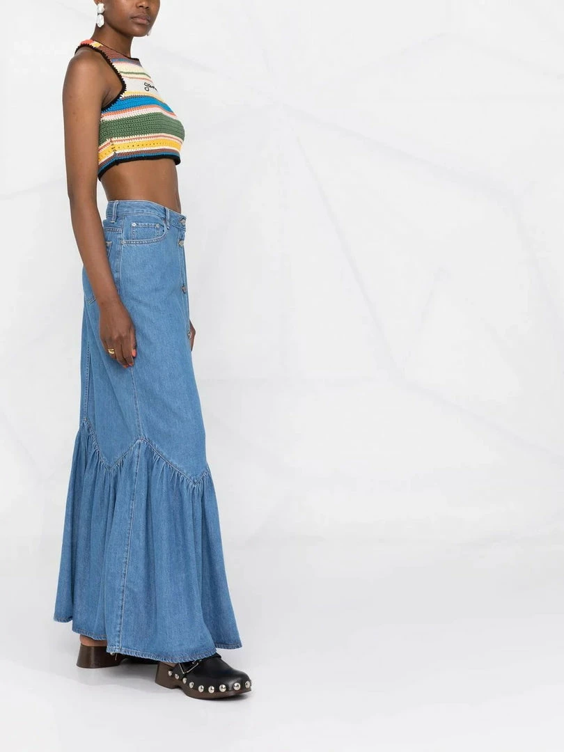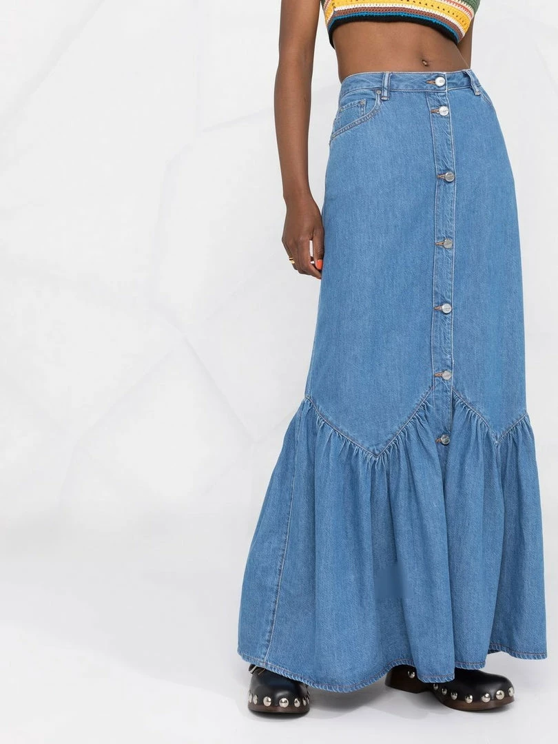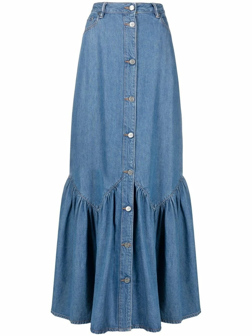Ganni blue ‘Denim Ruffled Hem Skirt’ featuring front button fastenings, belt loops, a five pocket design, a logo patch on the back, a ruffled hemline, a maxi length and a flared style. Item fits true to size. Model is wearing a size 36 FR.