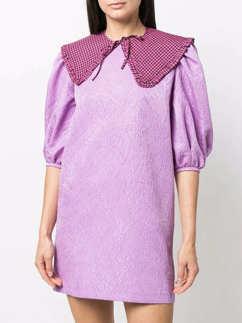 Ganni hot pink ‘Gingham Ruffled Collar’ featuring a tie front fastening, a black gingham print, ruffled trimming and an oversized style. Item is One Size. Made in Turkey.Â