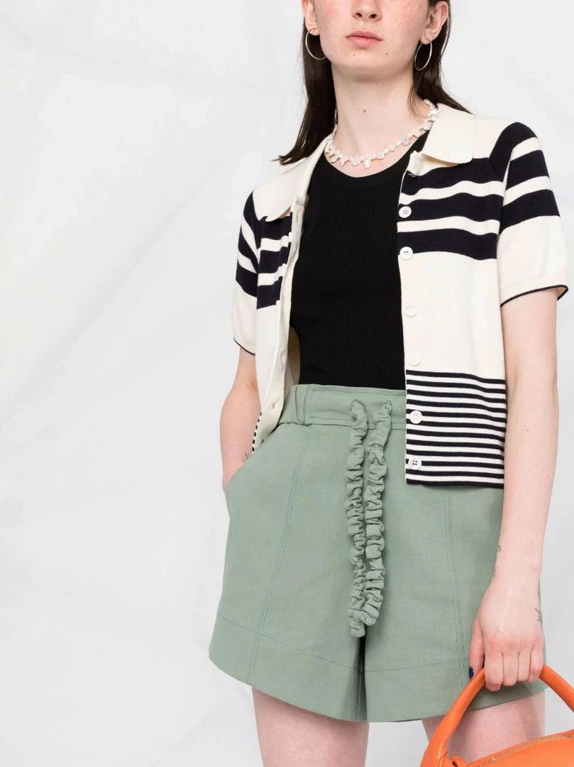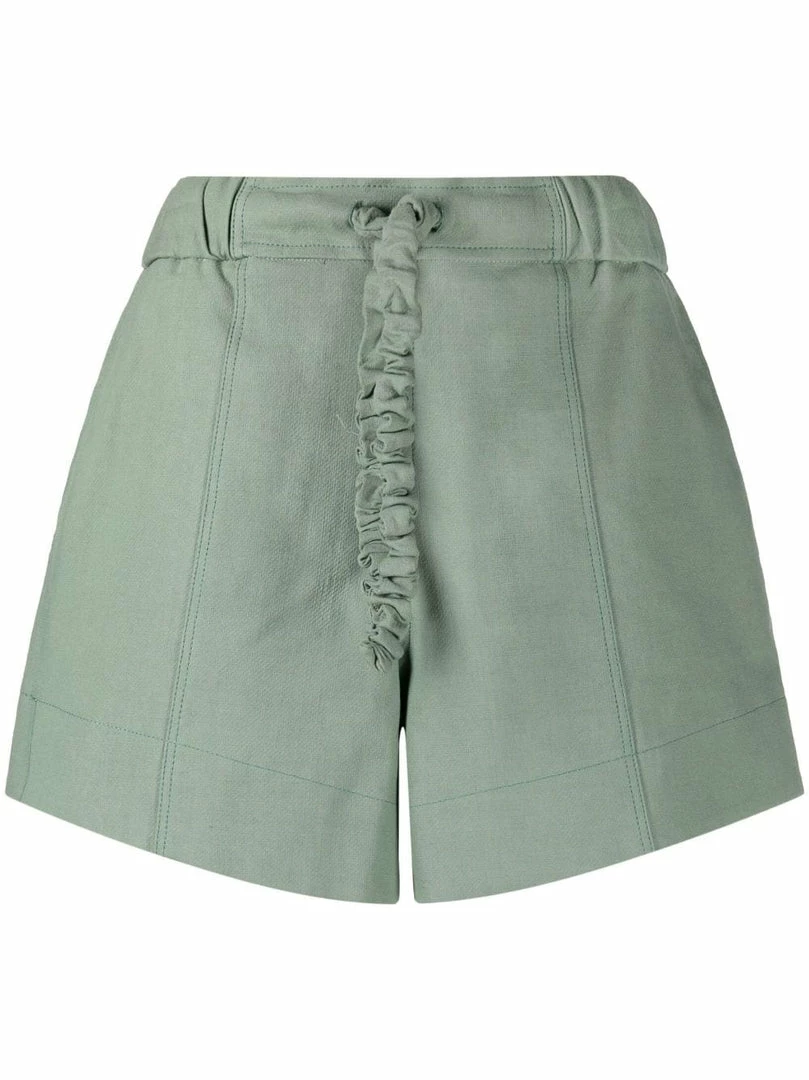 Ganni green ‘Crinkled Drawstring Detail Shorts’ featuring a drawstring waist, side slip pockets, a back pocket detail and pulls on. Item fits true to size. Model is wearing a size 36 FR.