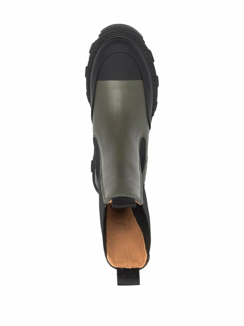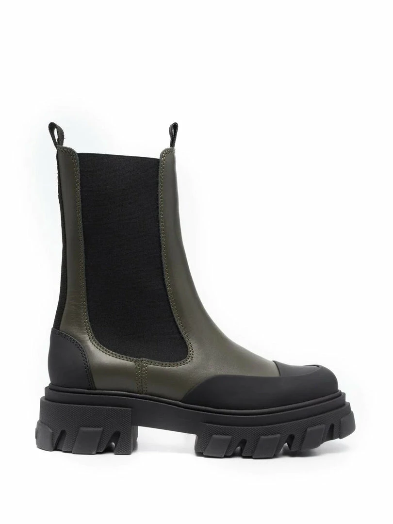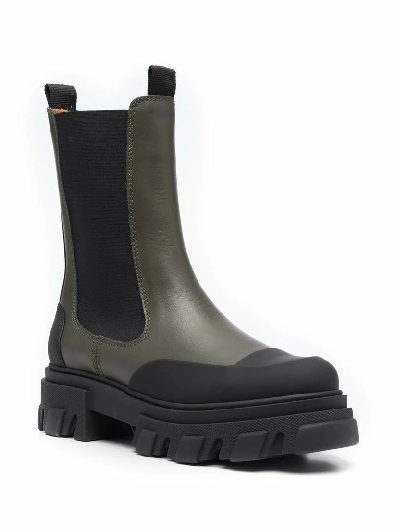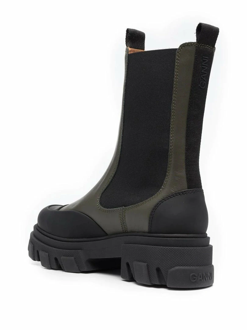 Ganni ‘Khaki And Black Calf High Chelsea Boots’ featuring a round toe, elasticated side panels, pull tabs and a chunky sole. Made in Portugal. Item fits true to size. European Sizing.