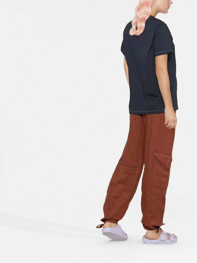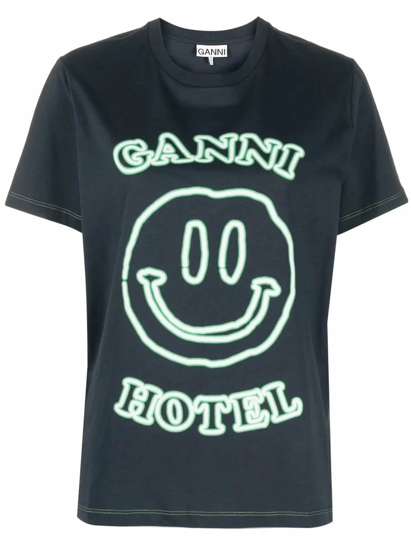 Ganni dark blue ‘Smiley Hotel T-shirt’ featuring a round neck, short sleeves, a graphic design on the front and pulls on. Item fits true to size. Model is wearing a size XS.