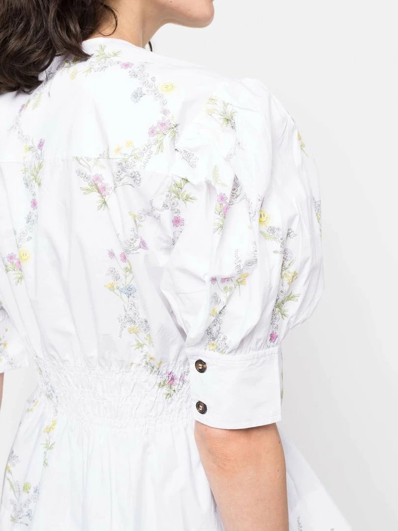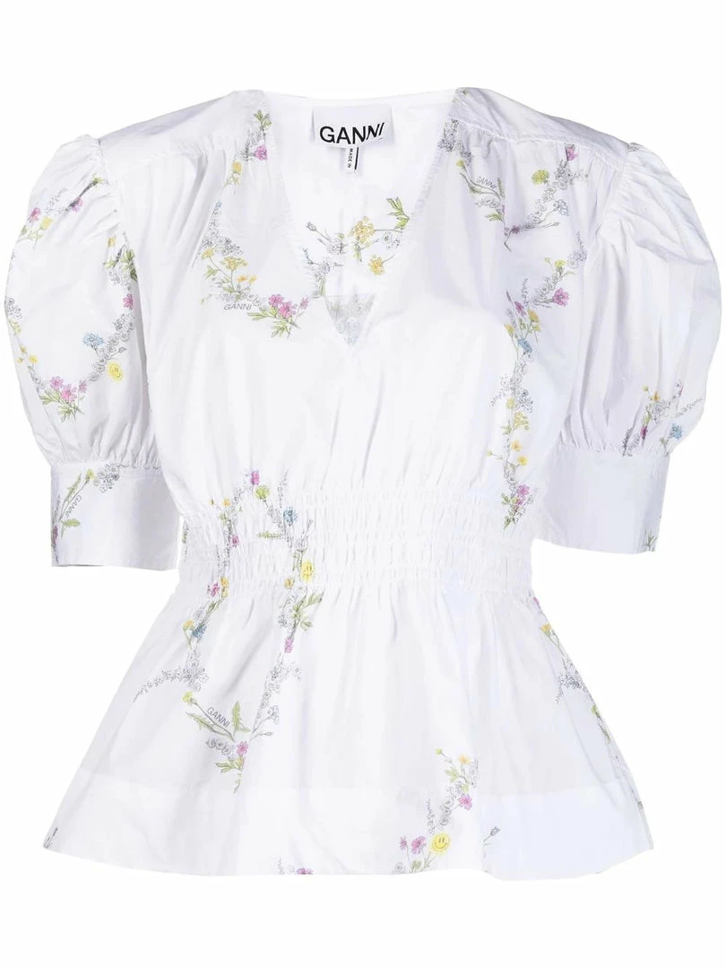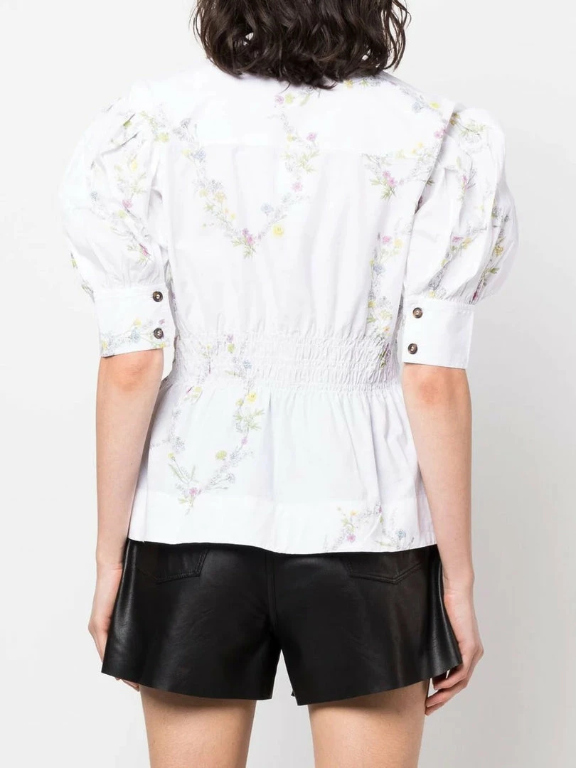 Ganni white ‘Floral Print Puff Sleeve Blouse’ featuring a v-neckline, a gathered waist, buttoned cuffs, a multicoloured floral and smiley face print, a flared hem and pulls on. Item fits true to size. Model is wearing a size 36 FR.