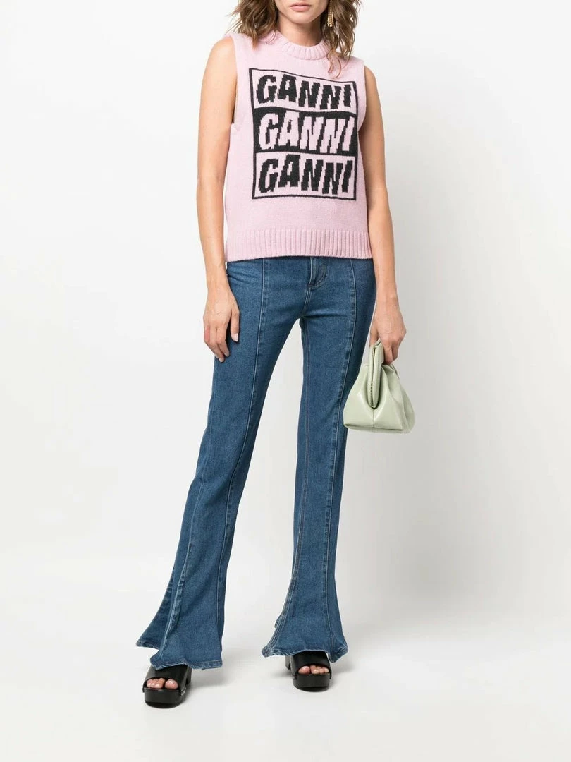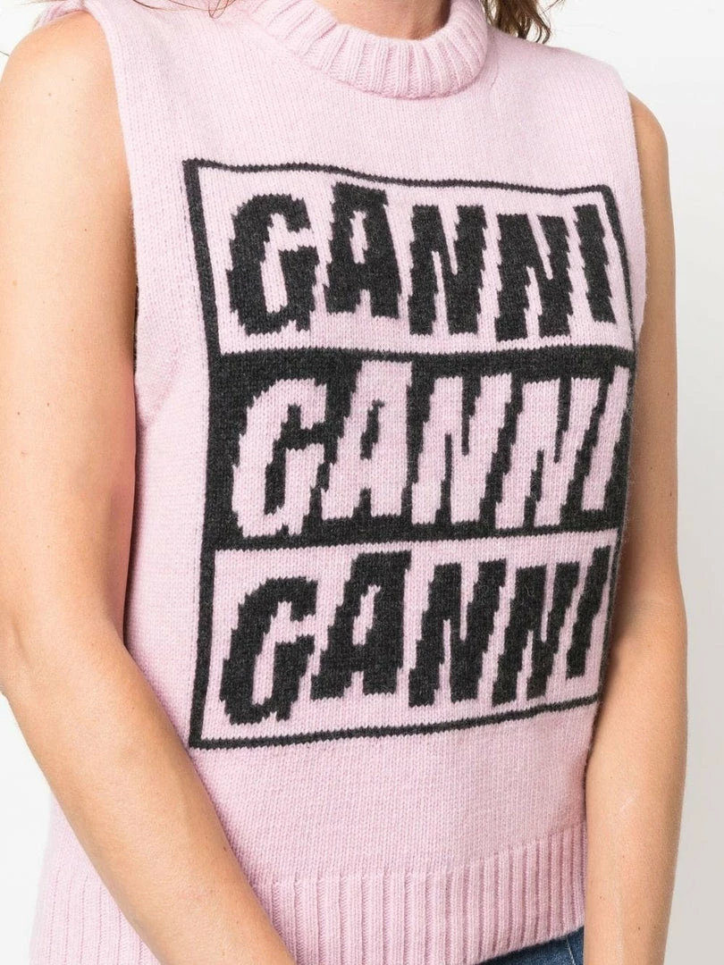 Ganni pink ‘Logo Sleeveless Knit Sweater’ featuring a round neck, ribbed trims, a black branded design on the front and pulls on. Item fits true to size. Model is wearing a size XS.Â