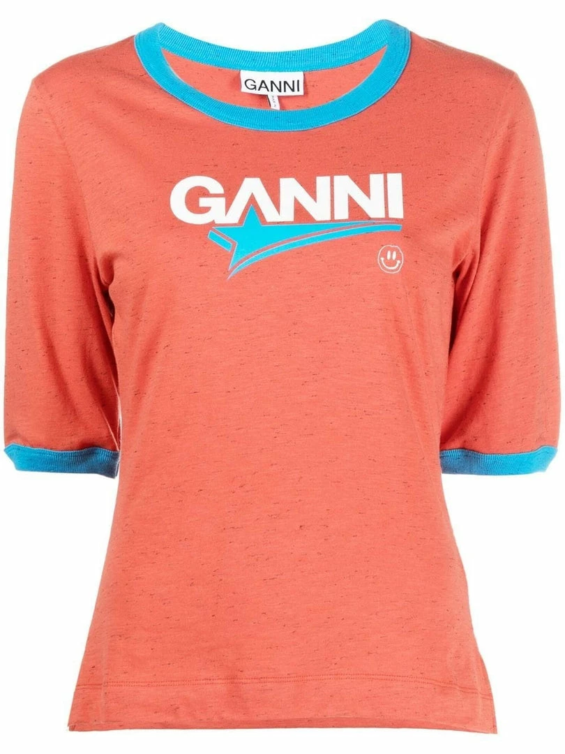 Ganni paprika toned ‘Logo Star T-shirt’ featuring a front white branded design with a white smiley face and blue star detail, a back white lip design, contrasting blue trims, side slits, an all over shredded black effect and pulls on. Item fits true to size. Model is wearing a size S.Â