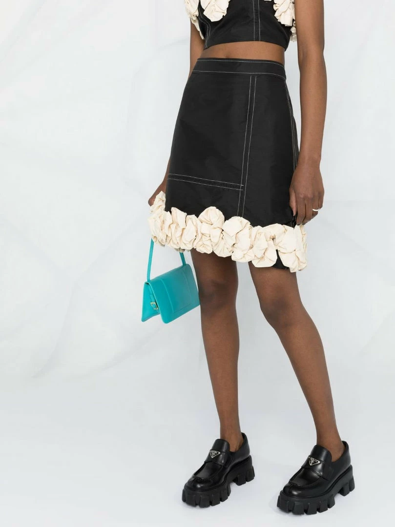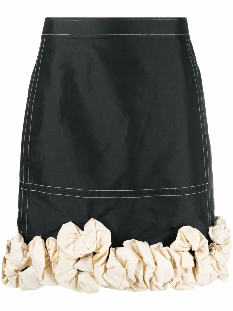 Ganni black ‘Ruffled Trim Skirt’ featuring a high waist fit, a back zip fastening, a cream 3D ruffled hem, contrasting white stitch detailing and a short length. Item fits true to size. Model is wearing a size 36 FR.
