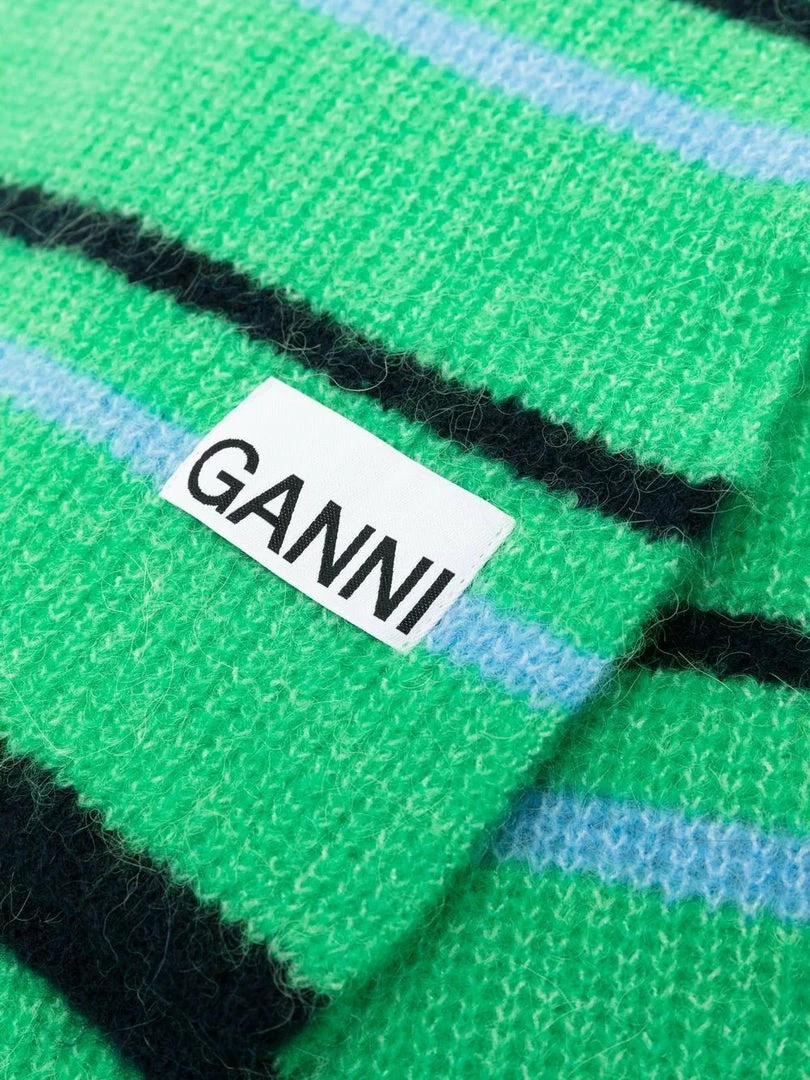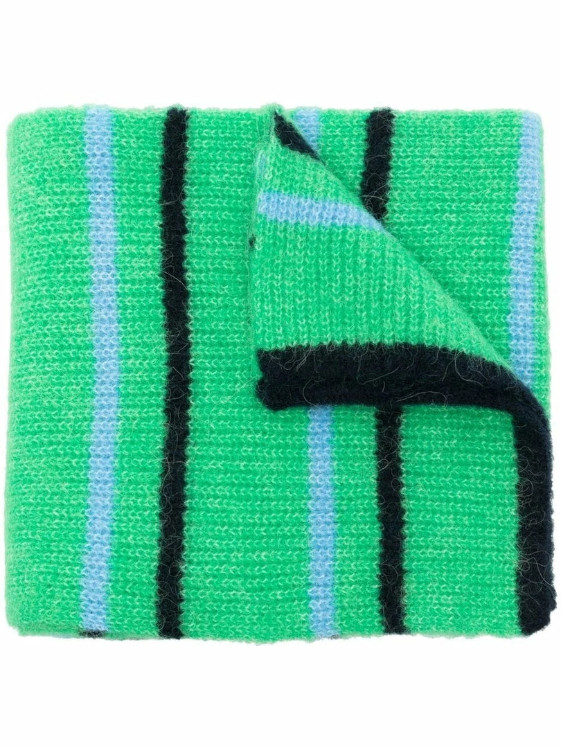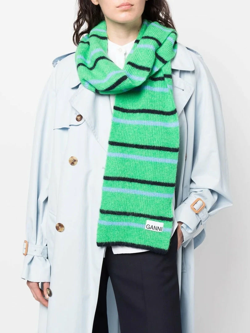 Ganni green ‘Striped Knit Scarf’ featuring a blue and black stripe design and a wrap around style. One Size.Â
