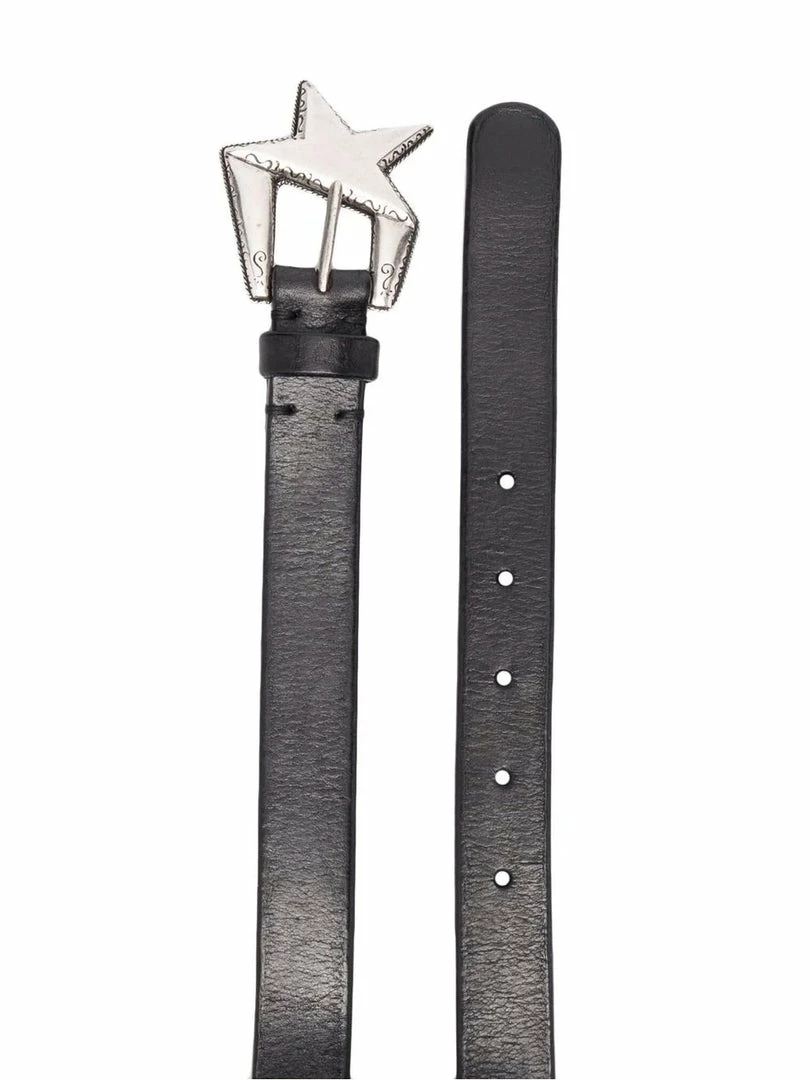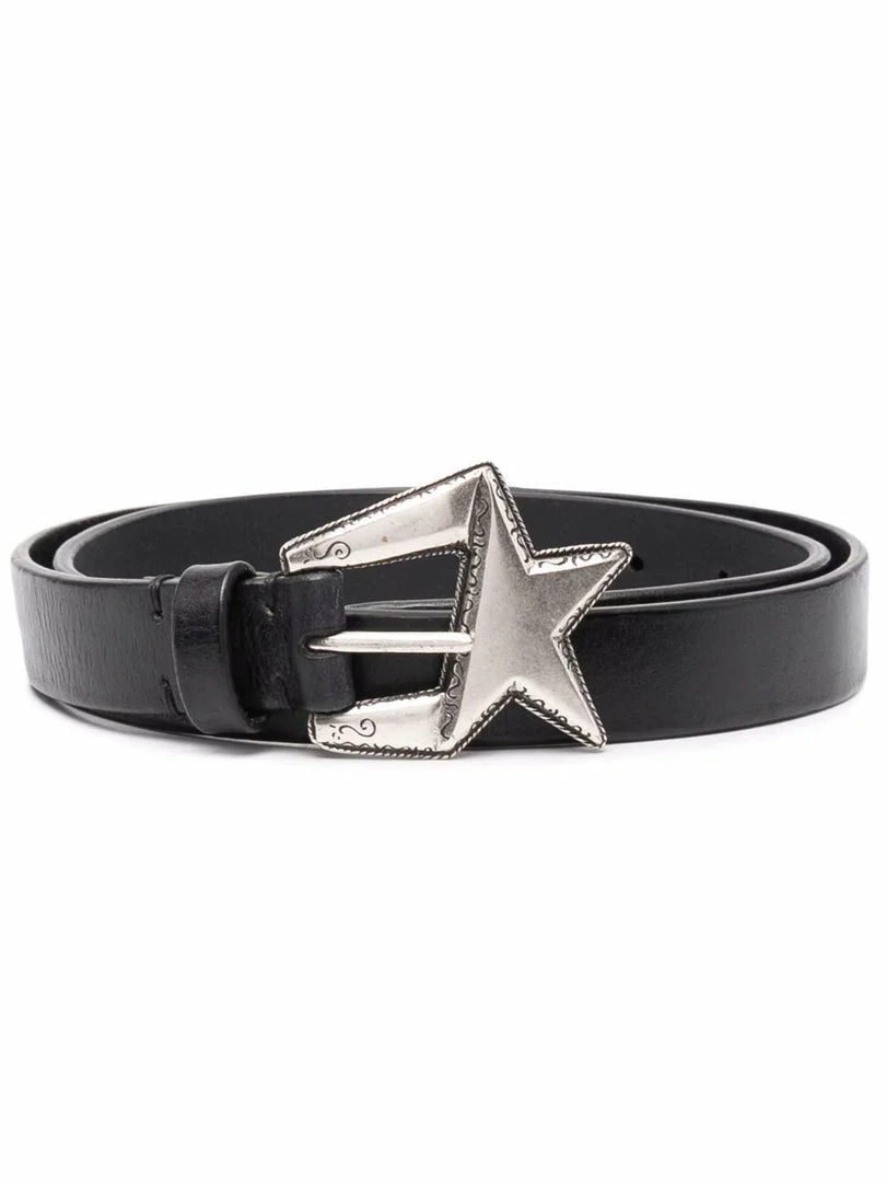 Golden Goose black leather ‘Star Buckle Belt’ featuring an engraved detail star buckle, five prong holes and silver tone hardware. Sizing in CM. Made in Italy.