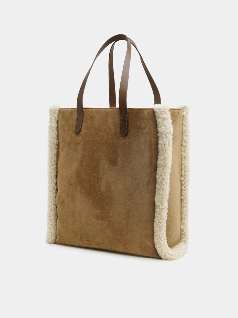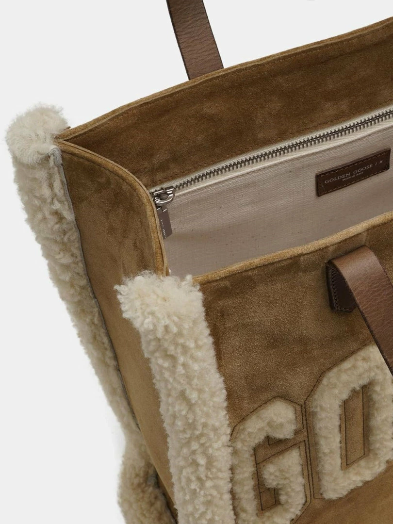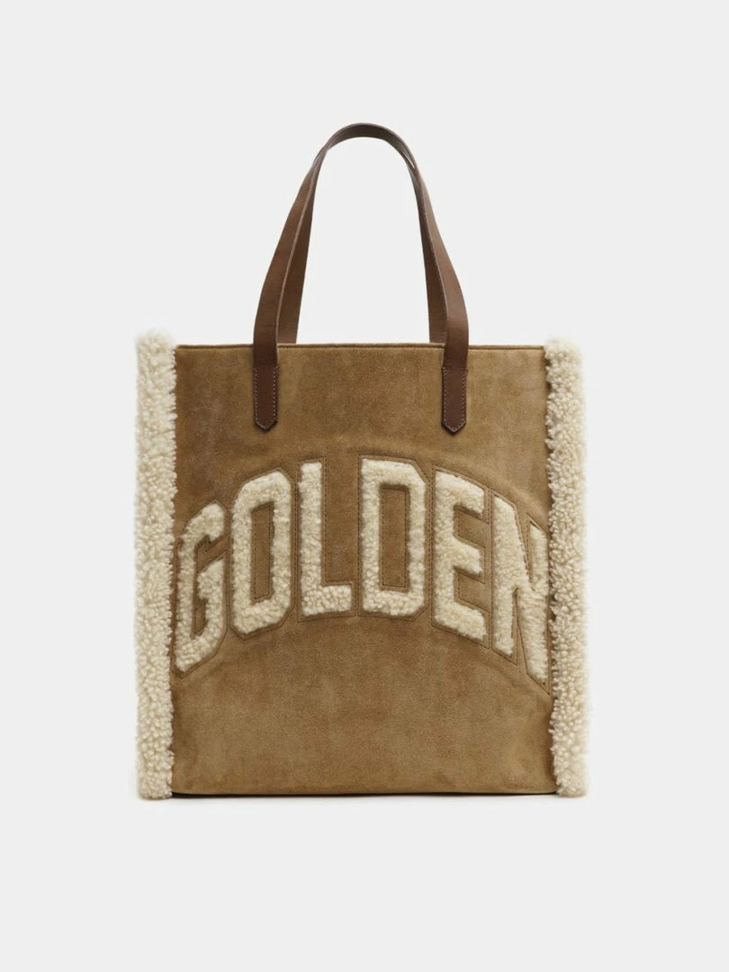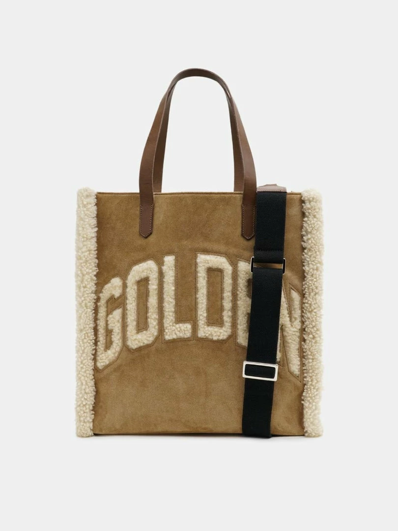Golden Goose camel ‘California’ shearling logo tote bag featuring two leather top handles, a shearling brand logo design on the front with shearling trimming, an open top, a zipped inner side pocket, two insert pockets and a suede finish. Comes with a black attachable and adjustable cross body strap. Made in Italy.