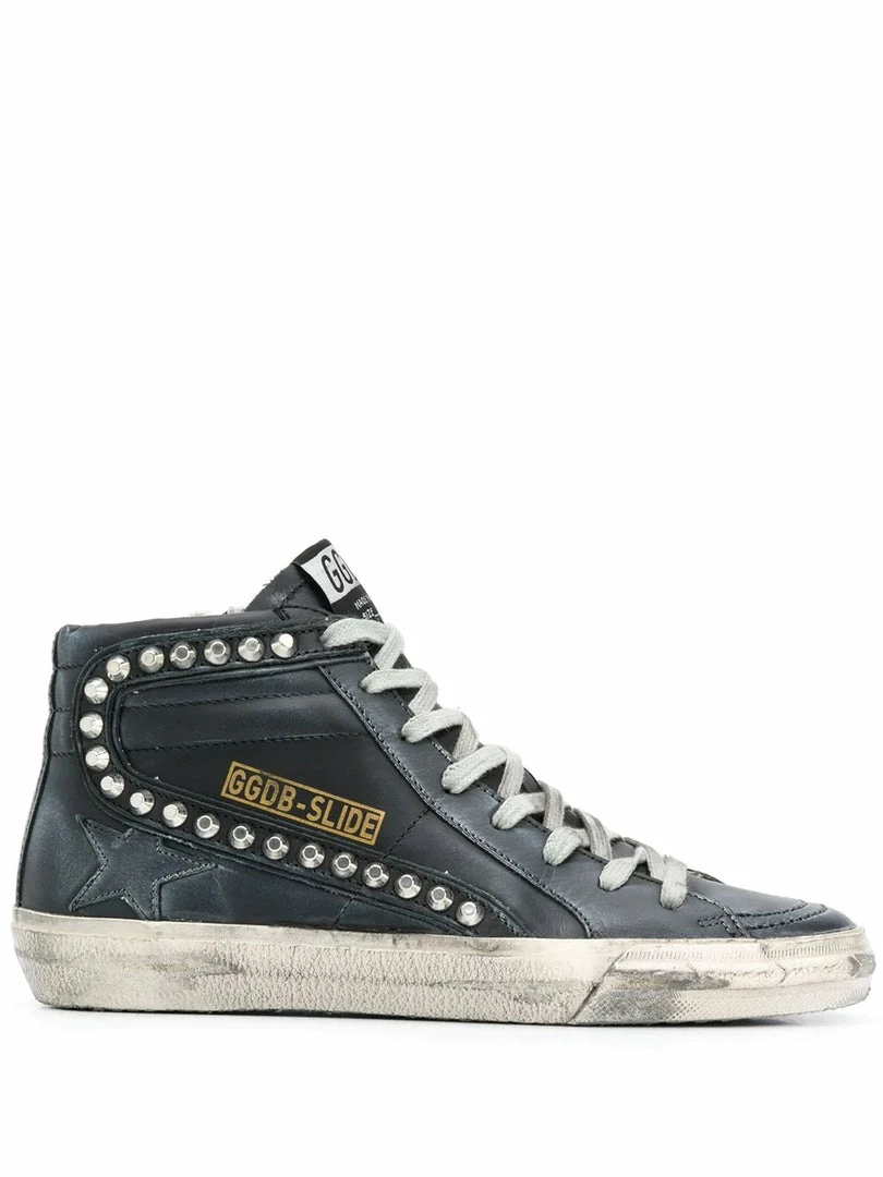 Golden Goose ‘Black Studded High Top Sneakers’ featuring a round toe, a lace-up fastening, a branded tongue, a signature star patch on the side, a gold branded logo on the side, silver-ware stud details, an inner side zip fastening, a distressed finish and a high top style. Item fits true to size. Italian izing. Made in Italy.