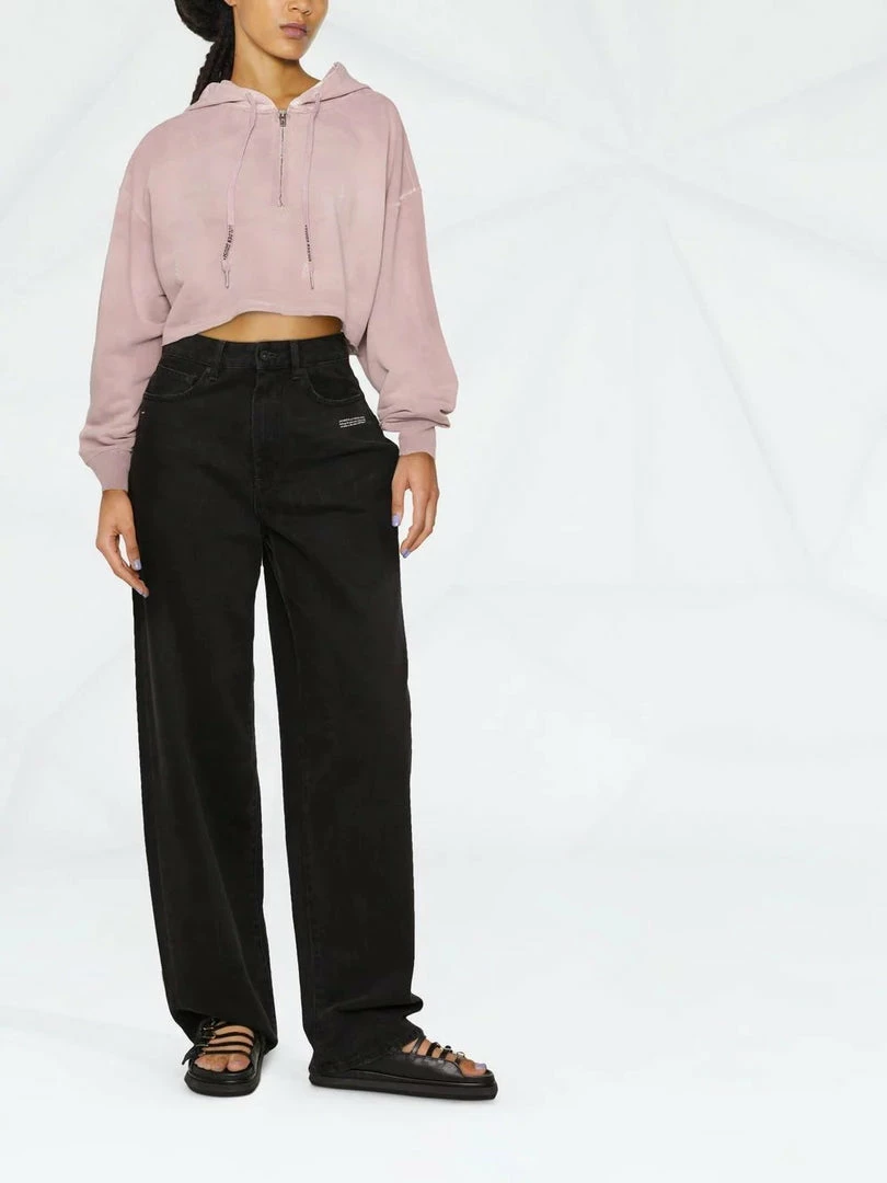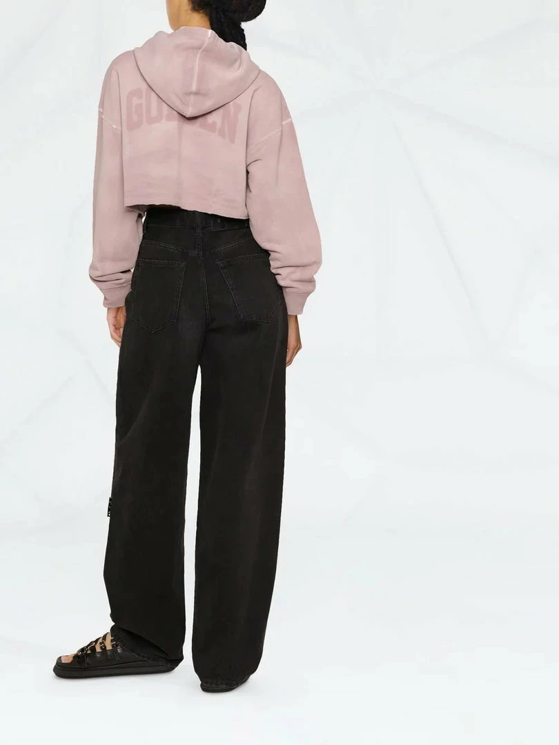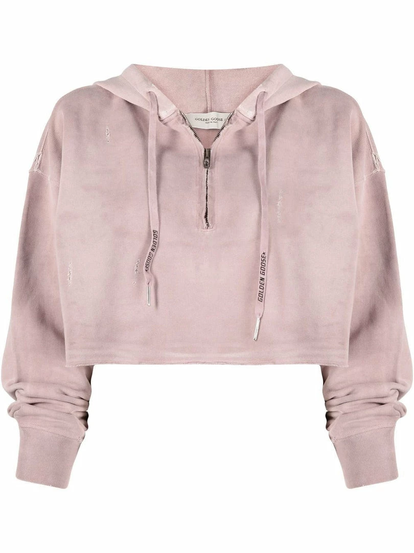 Golden Goose dusty pink ‘Distressed Cropped Hoodie’ featuring a drawstring hood, a front zip fastening, long sleeves, ribbed cuffs, a raw hem finish, a distressed design, a faint logo graphic on the back and a cropped fit. Item fits true to size. Model is wearing a size S.
