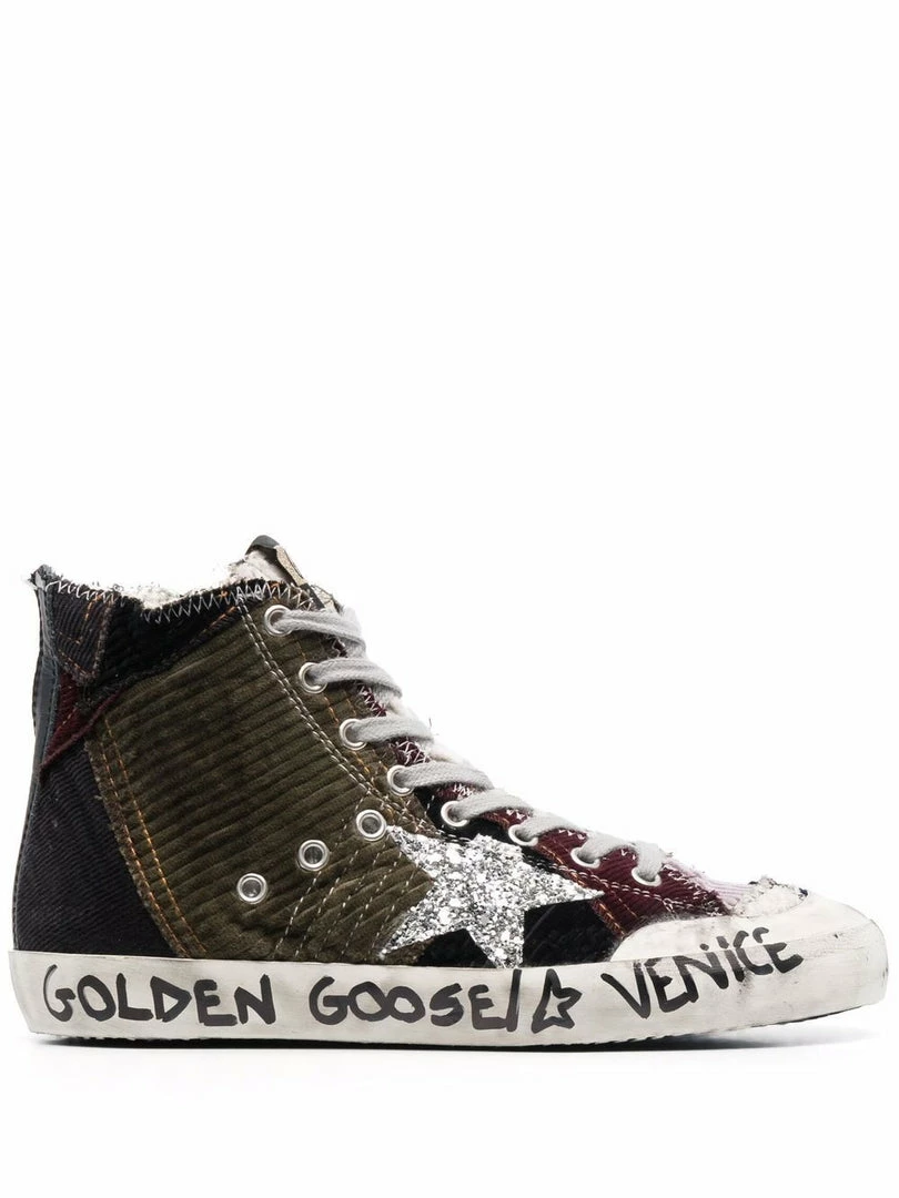 Golden Goose ‘Francy Penstar’ patchwork high top sneakers featuring a round toe, a front lace-up fastening, an inner side zip closure, a silver glitter signature star detail on the outer side, a brand logo rubber patch on the inner heel, a multicoloured velvet corduroy patchwork design, a ‘Golden Goose Venice’ graphic on distressed soles and a high top style. Item fits true to size. Italian Sizing. Made in Italy.