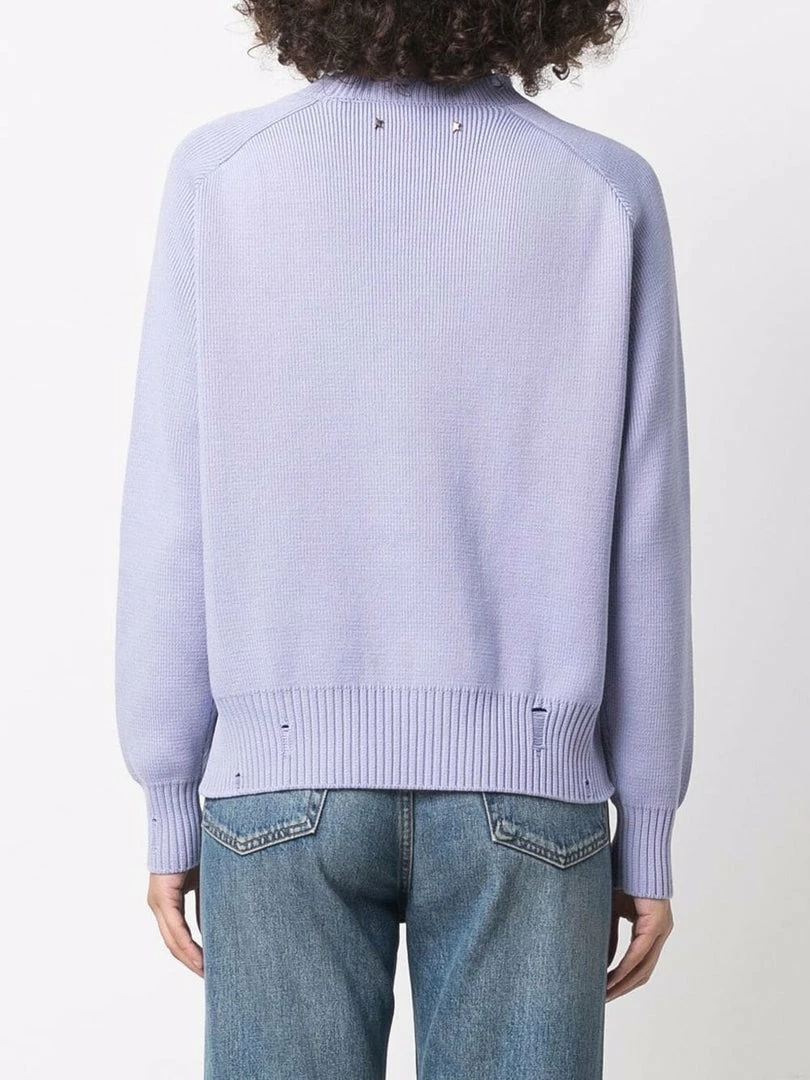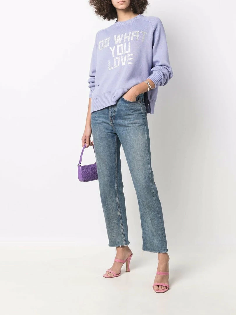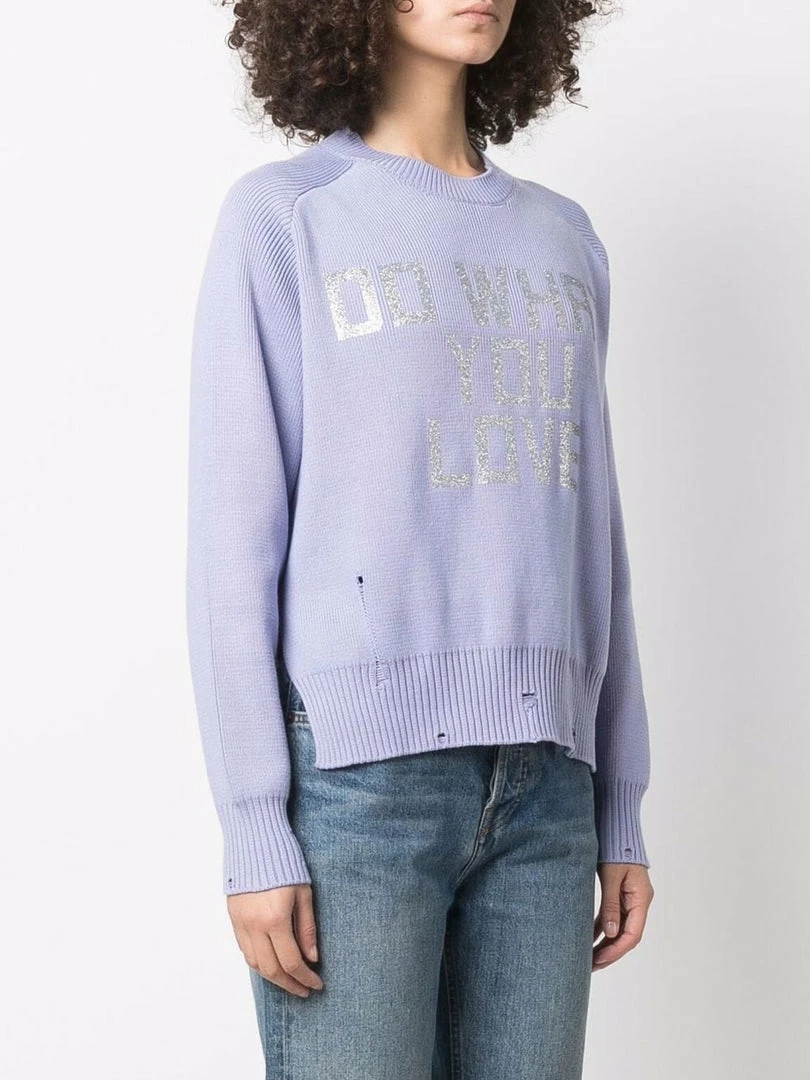 Golden Goose lilac ‘Delilah’ ribbed knit slogan sweater featuring a crew neckline, long sleeves, a ‘Do What You Love’ silver glitter slogan on the front, side slits, distressed details, a ribbed knit and pulls on. Item fits true to size. Model is wearing a size S.