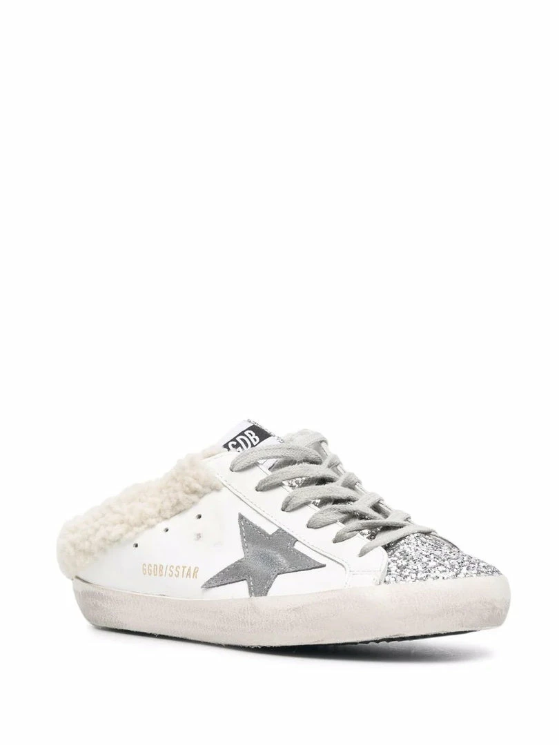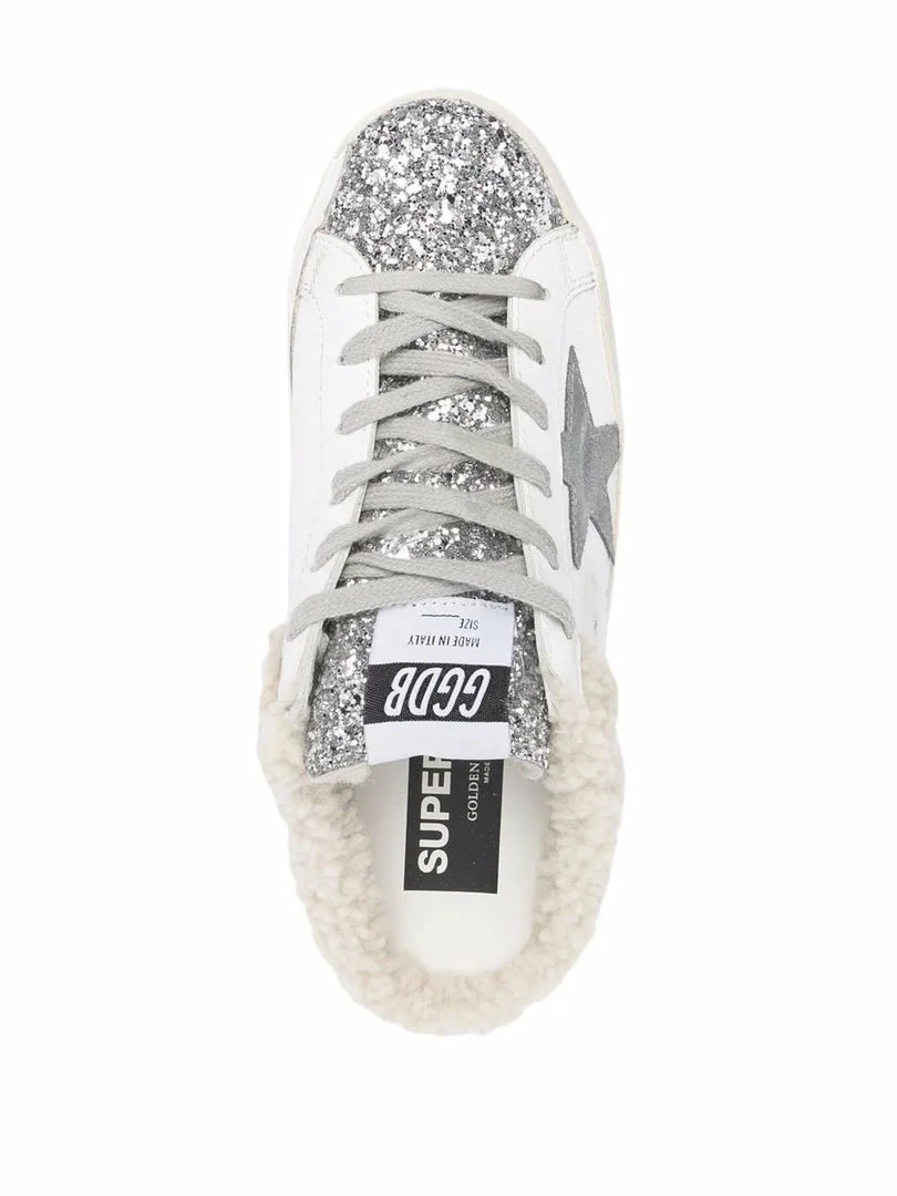 Golden Goose white ‘Sabot Super-Star’ shearling glitter sneakers featuring a round toe, a grey front lace-up fastening, a silver glitter tongue, a grey suede signature star patch on the side, shearling lining, a distressed sole and a slip on style. Item fits true to size. Italian Sizing. Made in Italy.