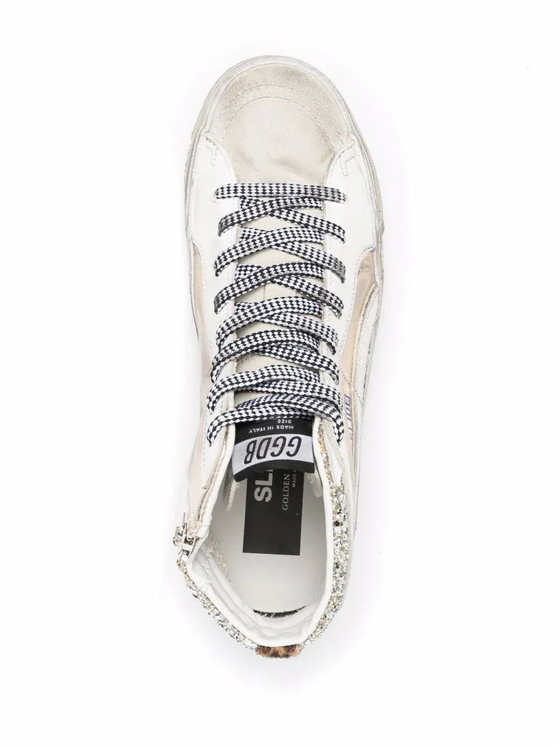 Golden Goose ‘Gold Glitter Slide Sneakers’ featuring a round toe, a lace-up fastening, glitter details, a branded ‘Slide’ embossed detail on the side, a leopard print pony hair stripe on the heel, a signature suede star on the outer side, an inner zip fastening, a mid high-top style and a distressed look. Item fits true to size. Italian Sizing. Made in Italy.