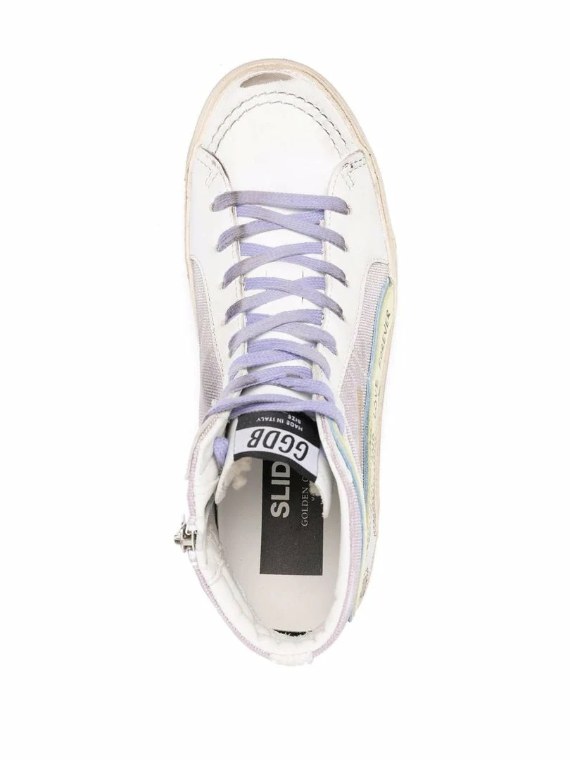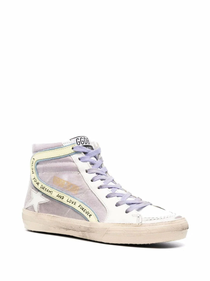Golden Goose ‘Lilac Glitter Shearling Slide Sneakers’ featuring a round toe, a lace-up fastening, glitter mesh effect details, a gold branded ‘Slide’ embossed design on the side, a white signature star on the outer side, a hand written slogan detail, an inside zip fastening, a mid high-top style, a distressed look and a detachable shearling sole insert. Item fits true to size. Italian Sizing. Made in Italy.