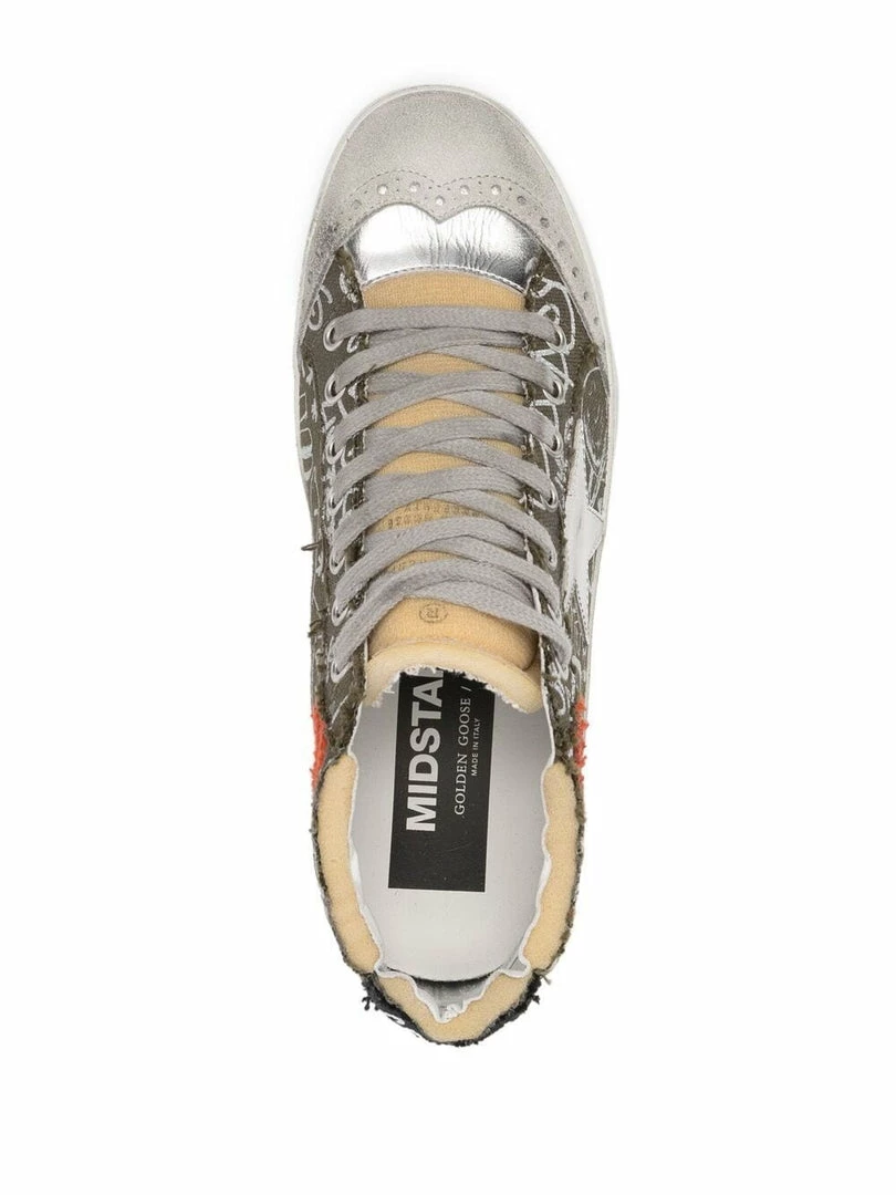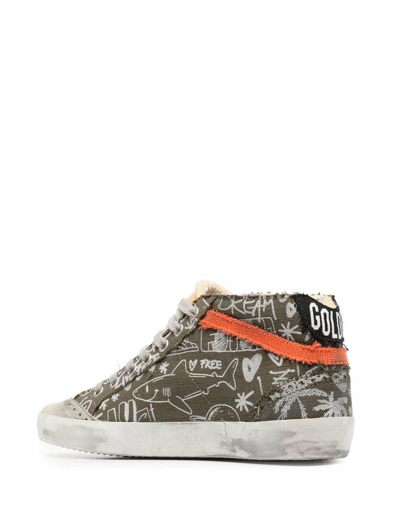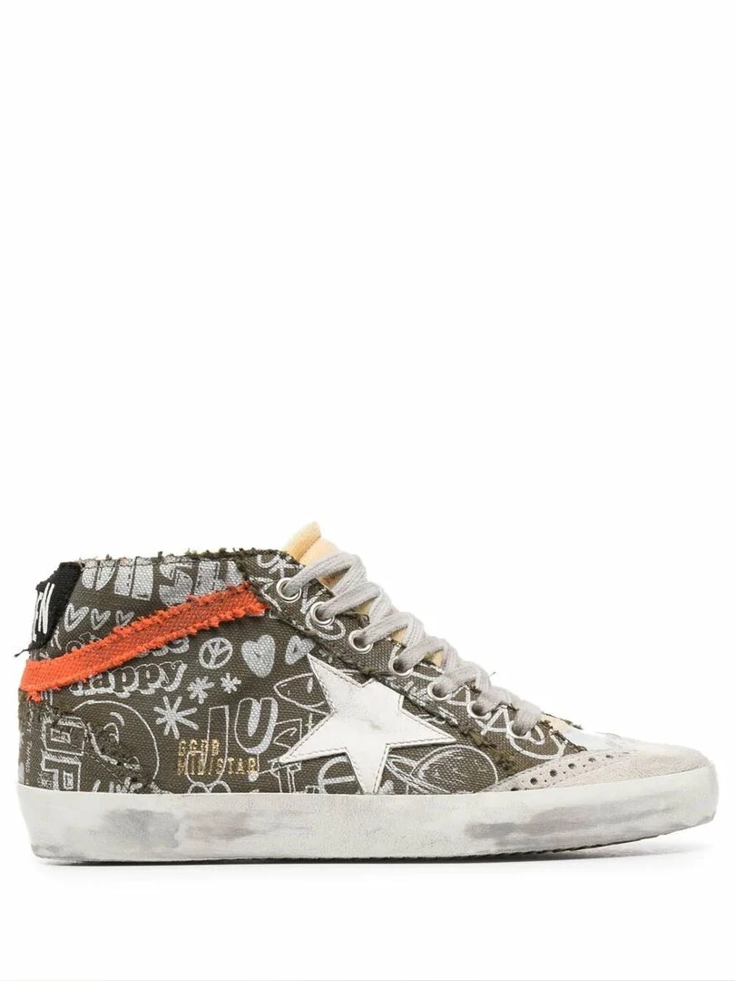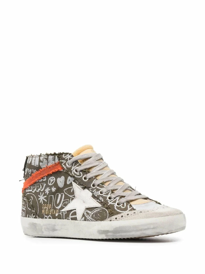 Golden Goose khaki ‘Mid Star’ doodle print sneakers featuring a round toe, a metallic front, a foam tongue, a lace up fastening, a doodle graffiti style print, a signature white star design on the side, a gold embossed logo on the side, a branded curved heel counter, a distressed look and a mid high-top style. Item fits true to size. Italian Sizing. Made in Italy.