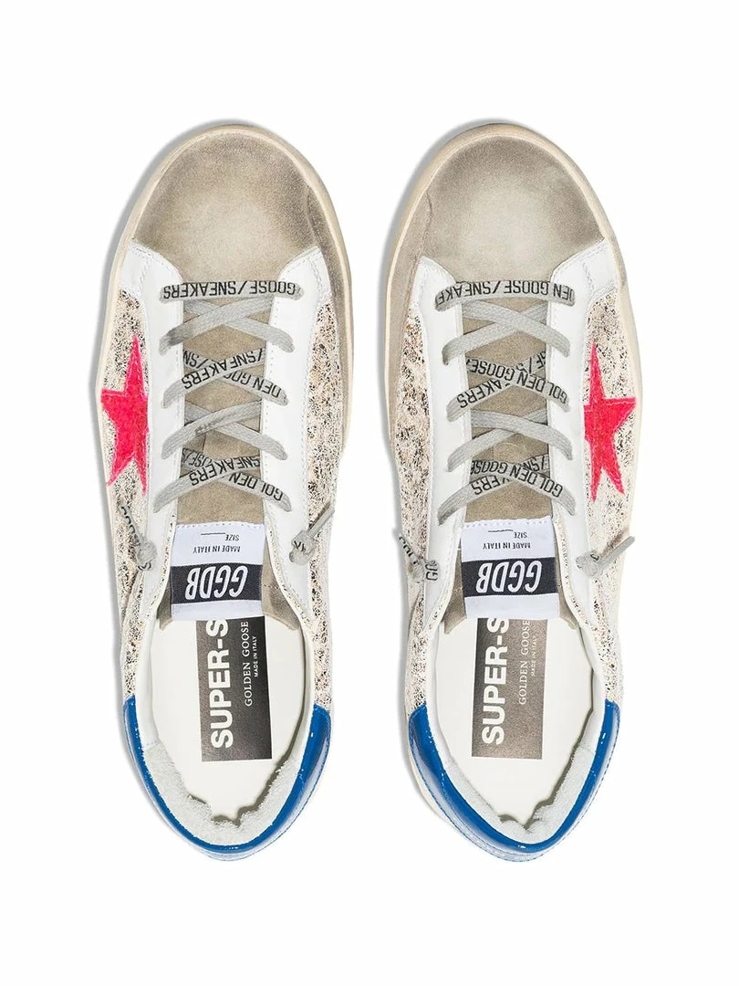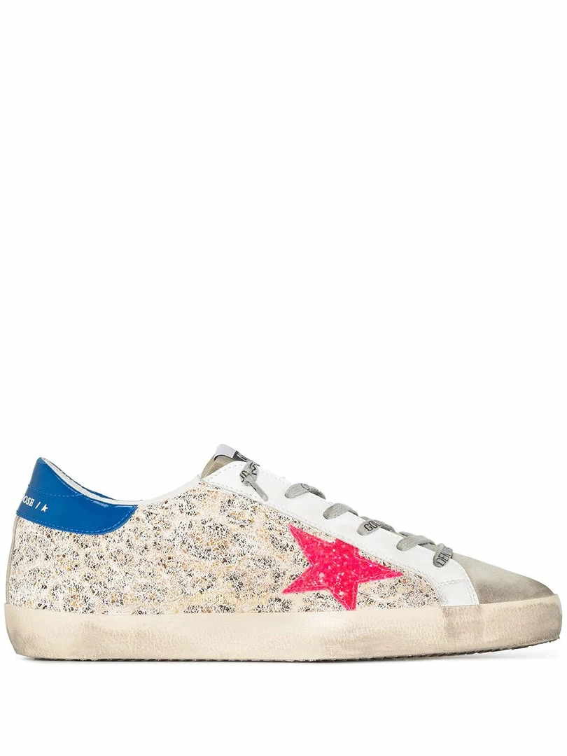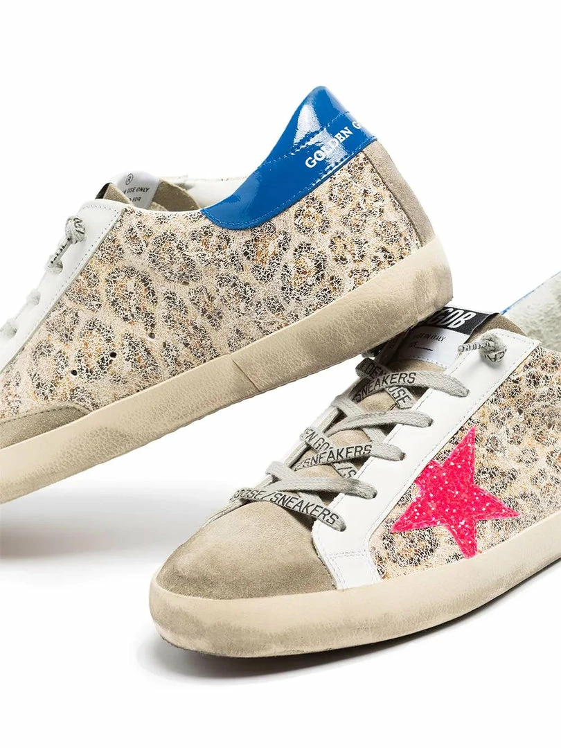 Golden Goose ‘Super-Star’ distressed leopard sneakers featuring a round toe, a branded front lace-up fastening, a grey suede tongue, a pink glitter signature star patch on the side, a blue heel counter, a distressed sole and a low top style. Item fits true to size. Italian Sizing. Made in Italy.