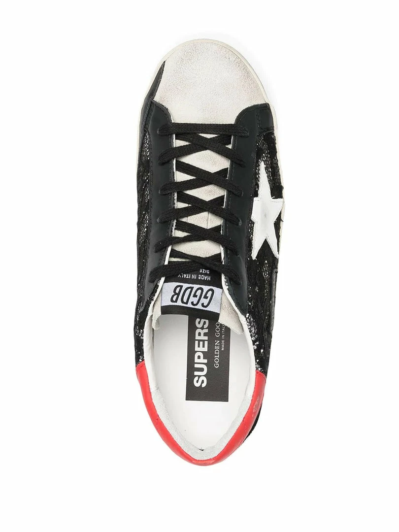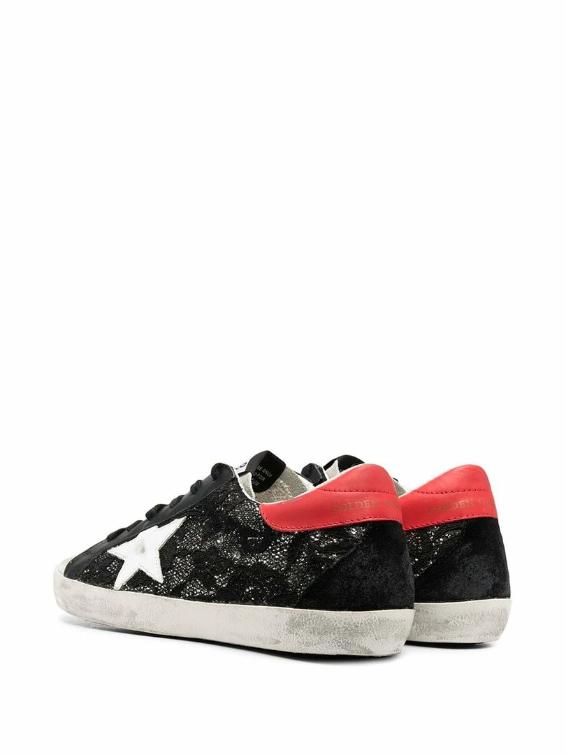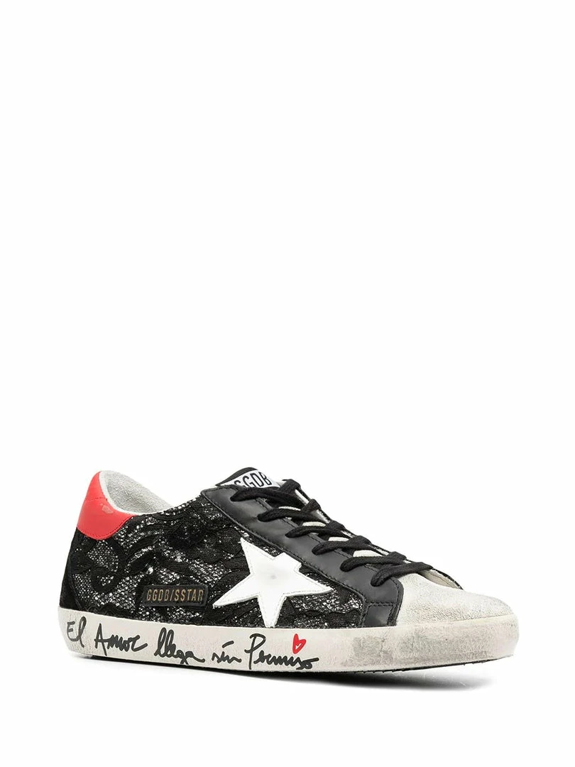 Golden Goose black ‘Superstar’ trainers featuring a round toe, a front lace up fastening, a signature star design to the side in white, a contrasting red heel counter at the rear, a branded insole, ornate embroidery details, a distressed finish and a scribbled slogan on the sole. Item fits true to size. Made in Italy. Italian Sizing.