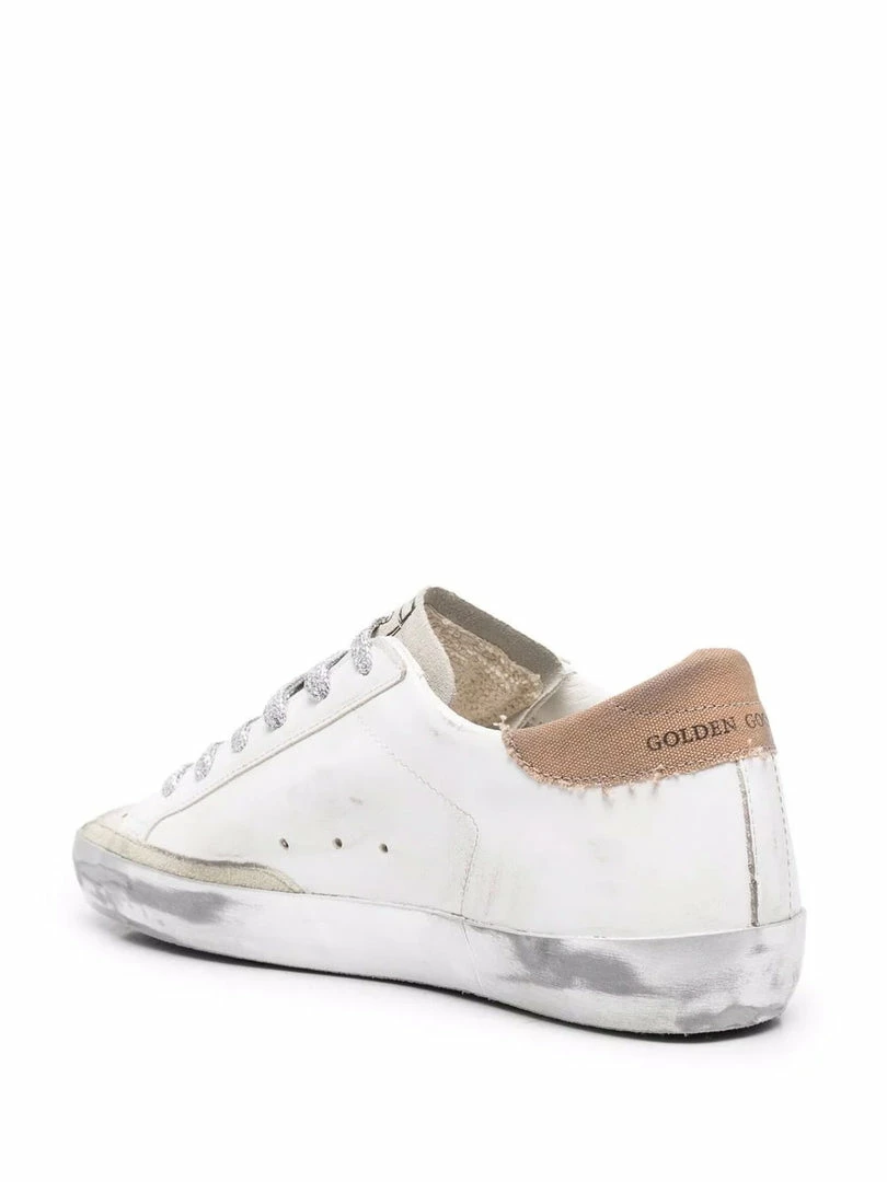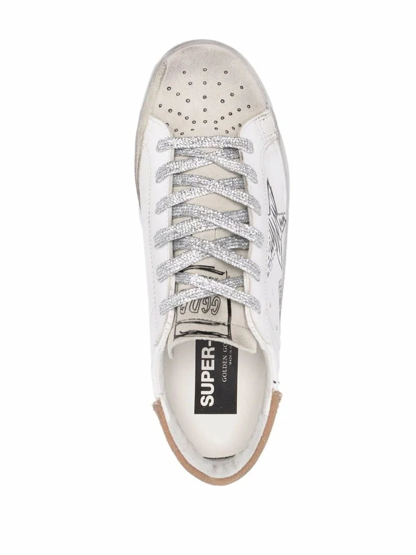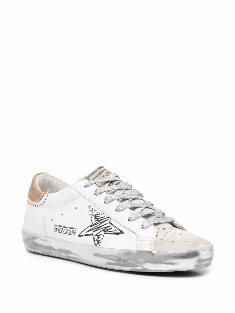 Golden Goose white ‘Superstar ‘ trainers featuring a round toe with a repeated drawn circle design, a front lace up fastening, a branded tongue and insole, a signature scribbled star design to the side with a written logo detail, a contrasting branded beige heel counter and a distressed finish. Made in Italy. Item fits true to size. Italian Sizing.