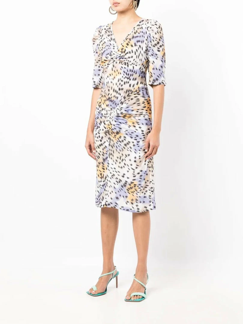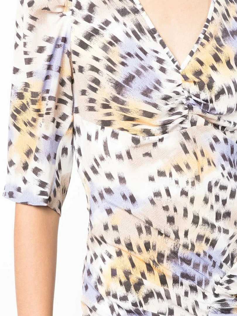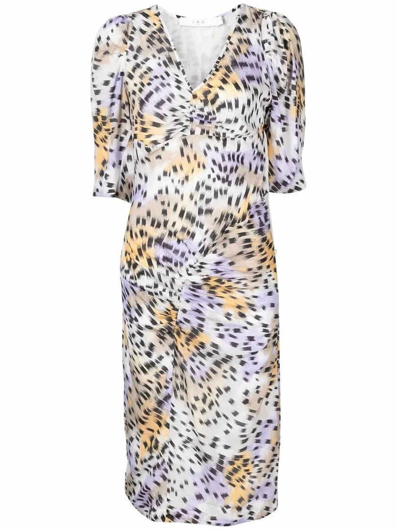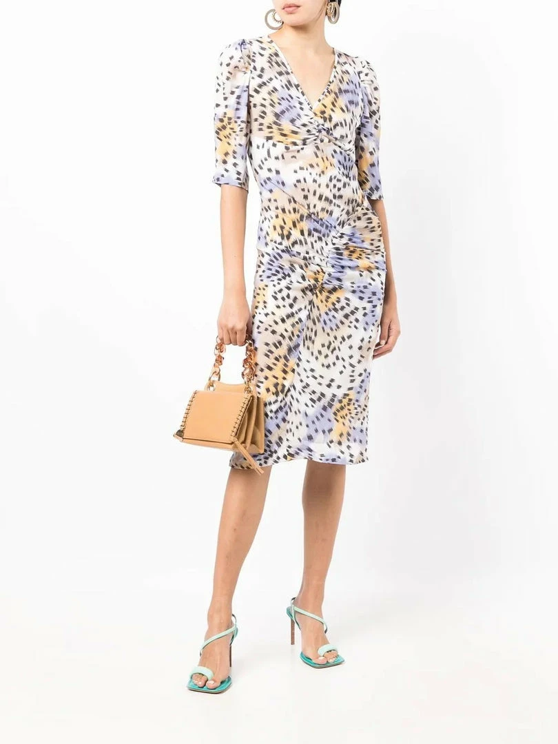 Iro ‘Linnea’ midi dress featuring a v-neckline, short puff sleeves, ruched detailing and a black, purple, orange and white toned print. Item fits true to size. Model is wearing a size 38 FR.