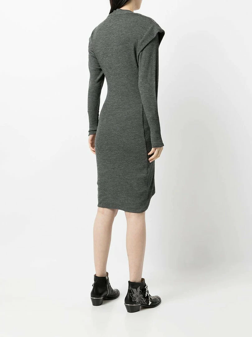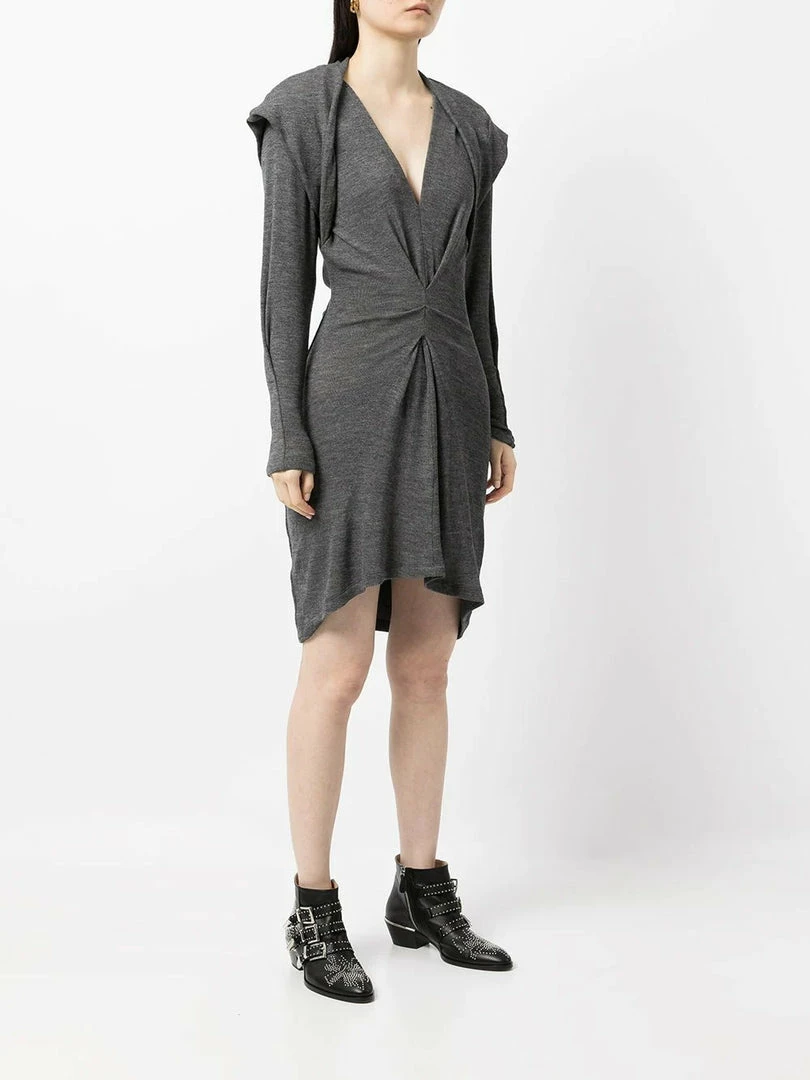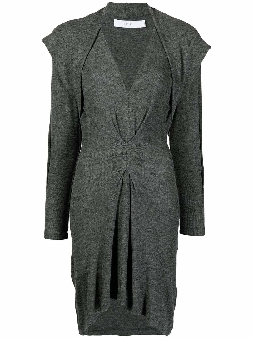 IRO grey ‘Kamila’ knitted mini dress from IRO featuring a layered V-neckline, long sleeves with pleated cuffs, a ruched front detail at the waist, a high-low hemline, a midi length and pulls on. Item fits true to size. Model is wearing a size S.Â
