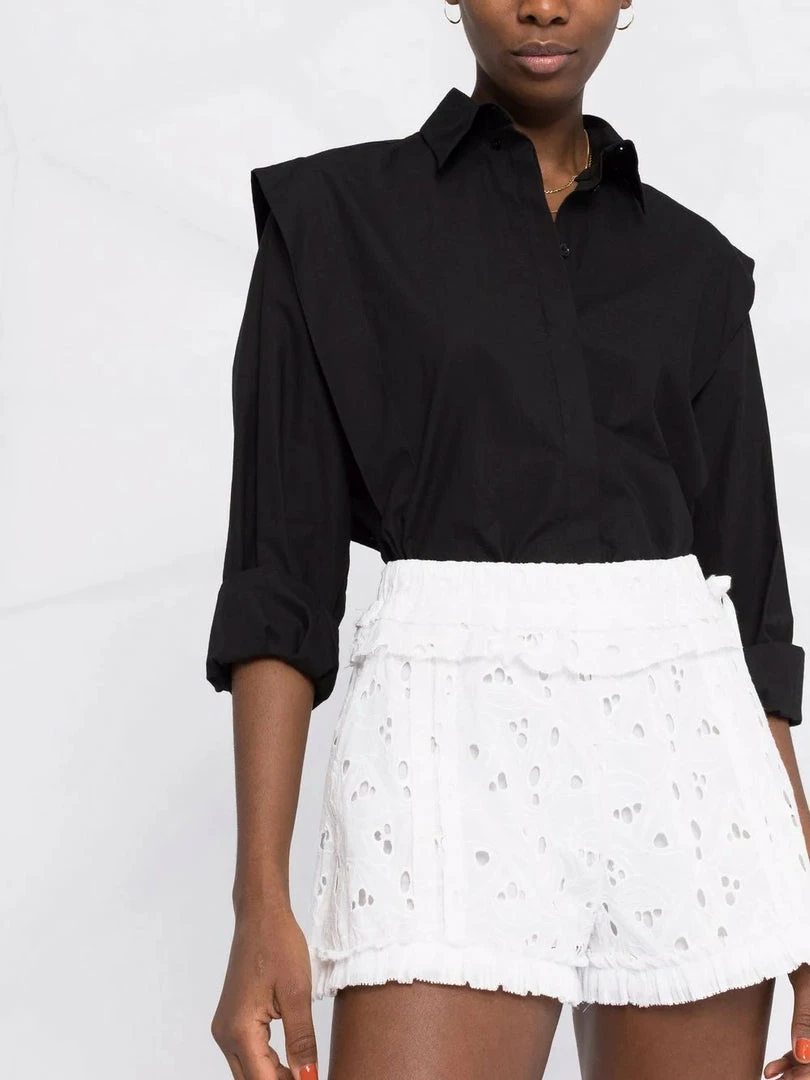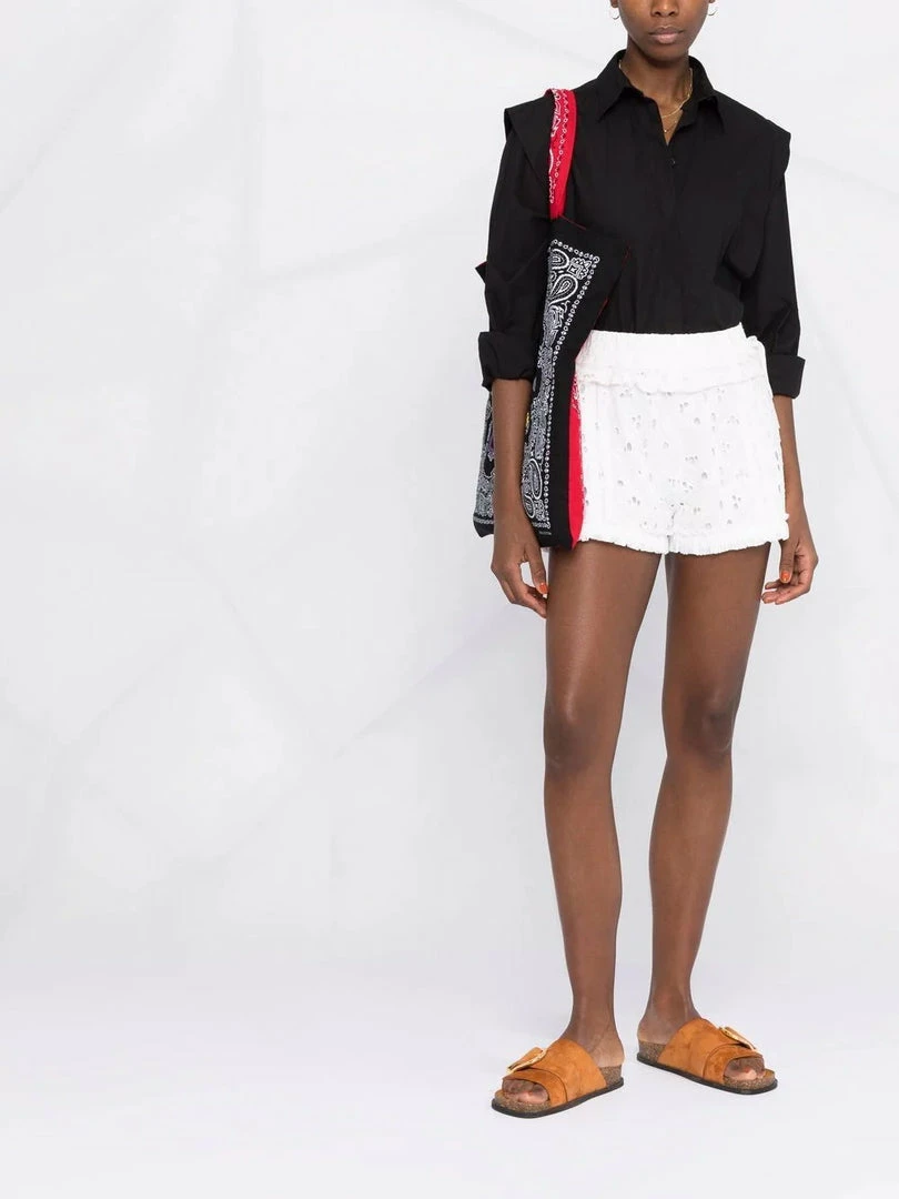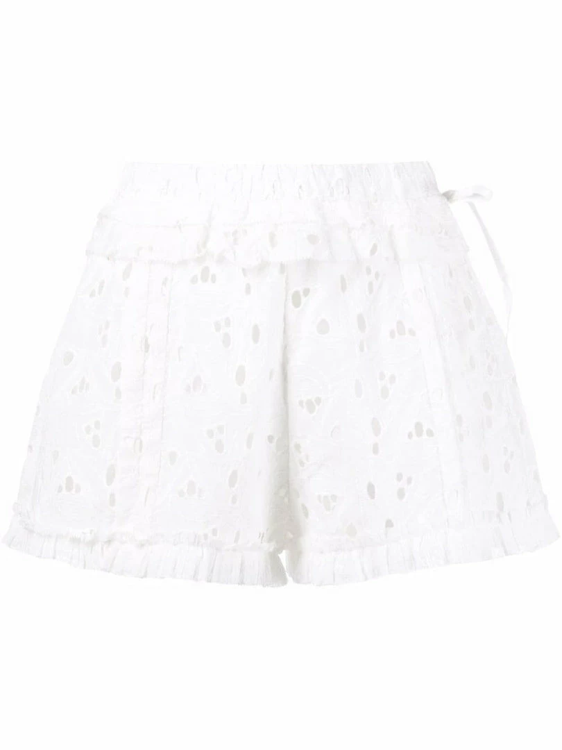 Iro white ‘Mikos’ shorts featuring an elasticated waistband with a side button and tie fastening, cut out floral detailing and pleated trimming. Item fits true to size. Model is wearing a size 36 FR. Â