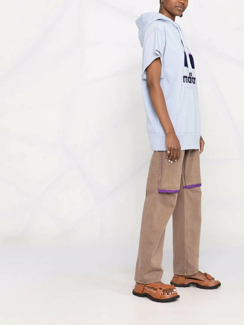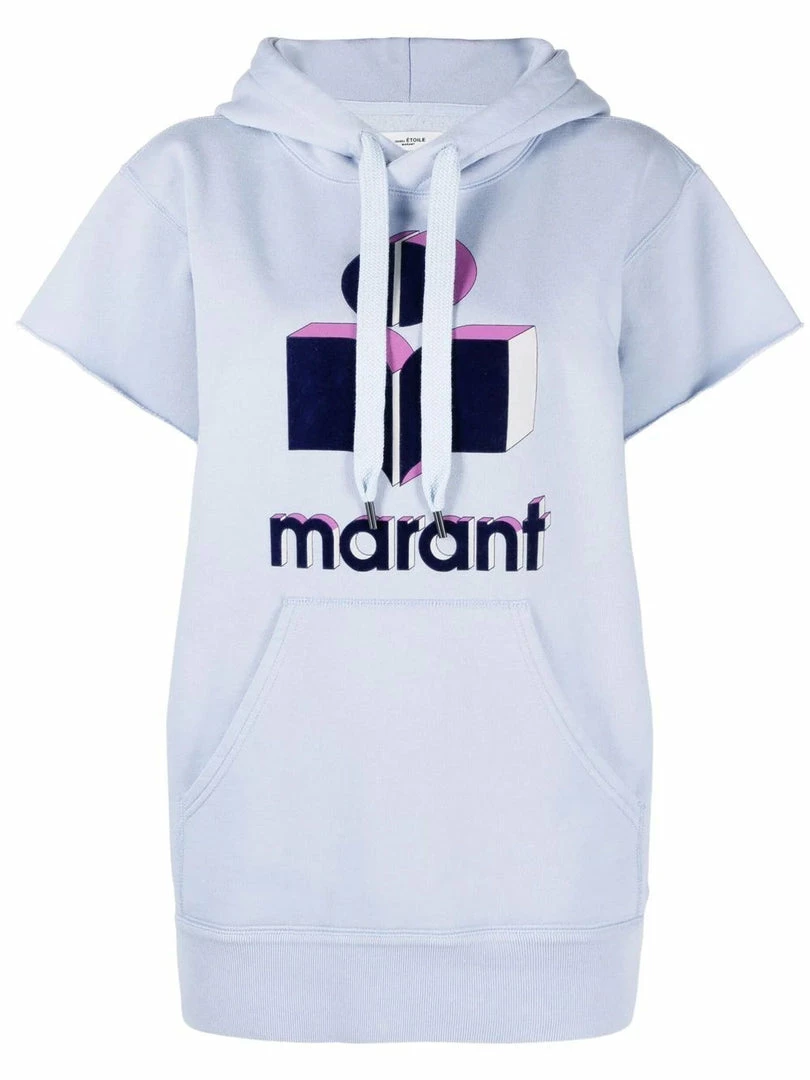 Isabel Marant Etoile light blue oversized ‘Milesy’ hoodie featuring a drawstring hood, short sleeves with raw hems, a graphic and velvet logo design on the front, a front kangaroo pocket, a ribbed hem and pulls on. Model is wearing a size 34 FR.Â