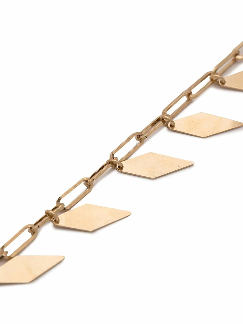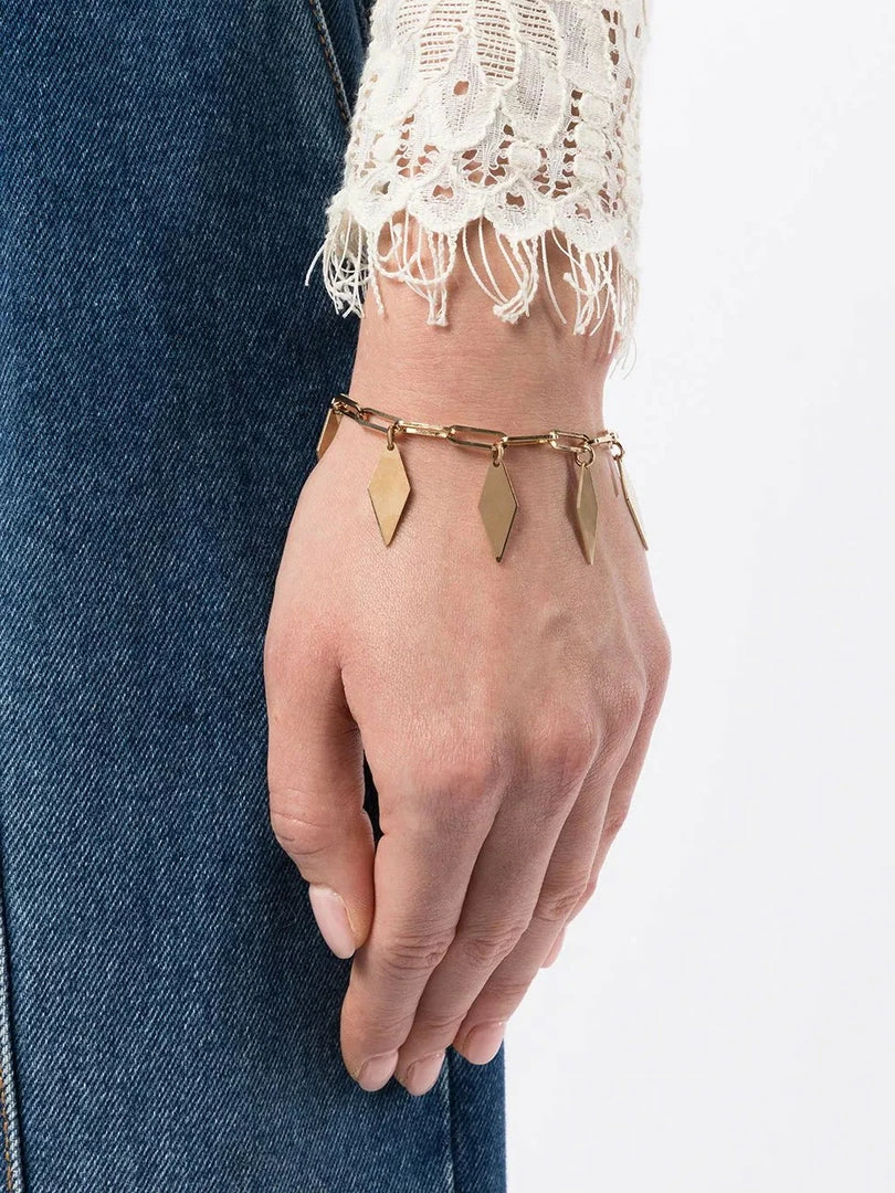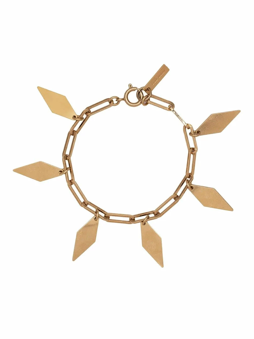 Isabel Marant ‘Multi Pendant Chain Bracelet’ featuring a spring ring fastening, a cable-link chain, diamond shaped pendants and gold tone hardware. Item is One Size. Made in Poland.Â