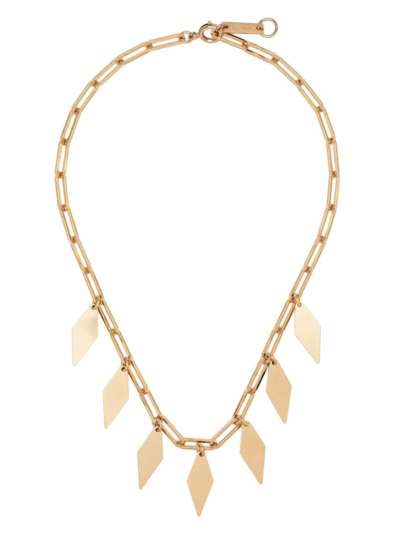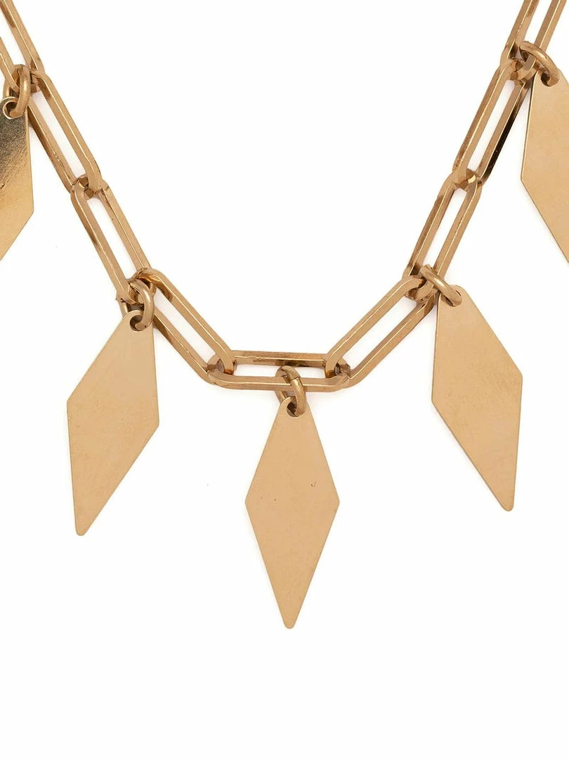 Isabel Marant ‘Multi Pendant Chain Choker’ featuring a spring ring fastening, a cable-link chain, diamond shaped pendants and gold tone hardware. Item is One Size. Made in Poland.Â