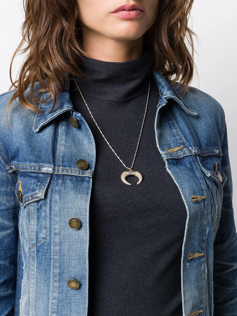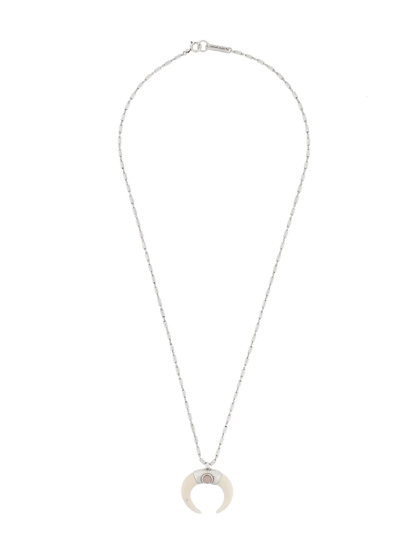 Isabel Marant ‘Silver Horn Pendant Necklace’ featuring a buffalo horn pendant, silver-tone hardware, a pink stone detail, an embossed logo and a lobster clasp closure. Made in Poland.