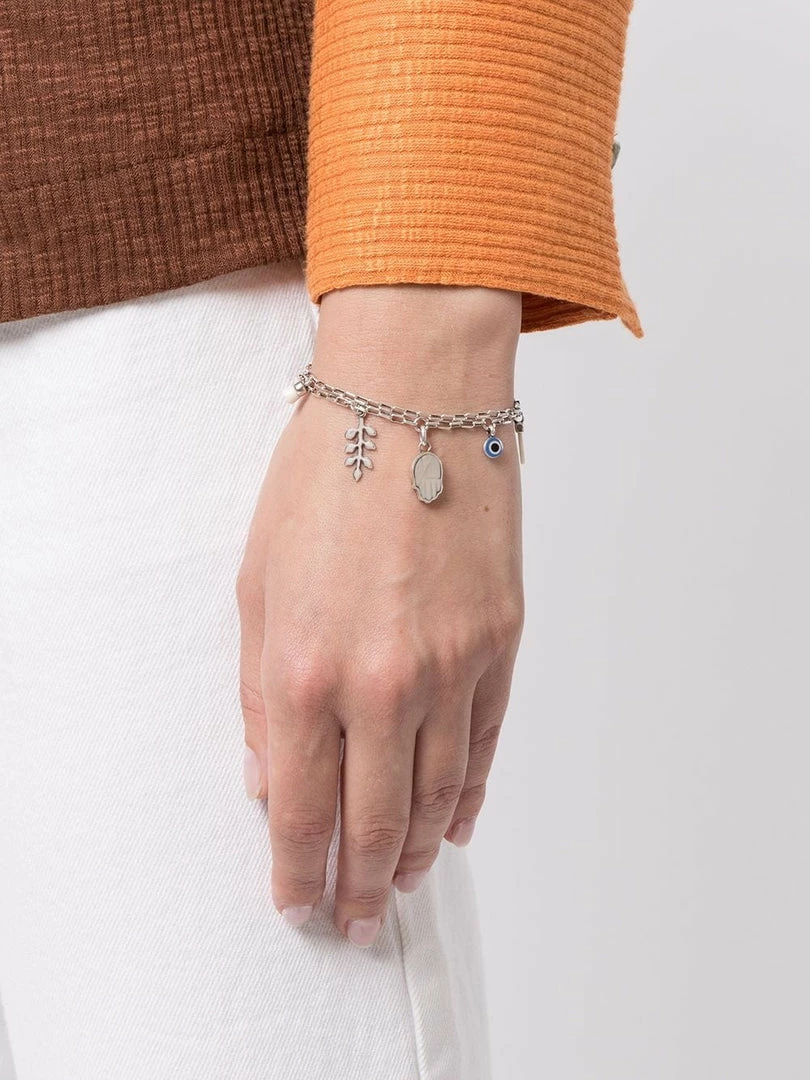 Isabel Marant ‘New It’s All’ bracelet featuring a spring ring fastening, a silver multi chain design and white charm pendants. Made in Poland.