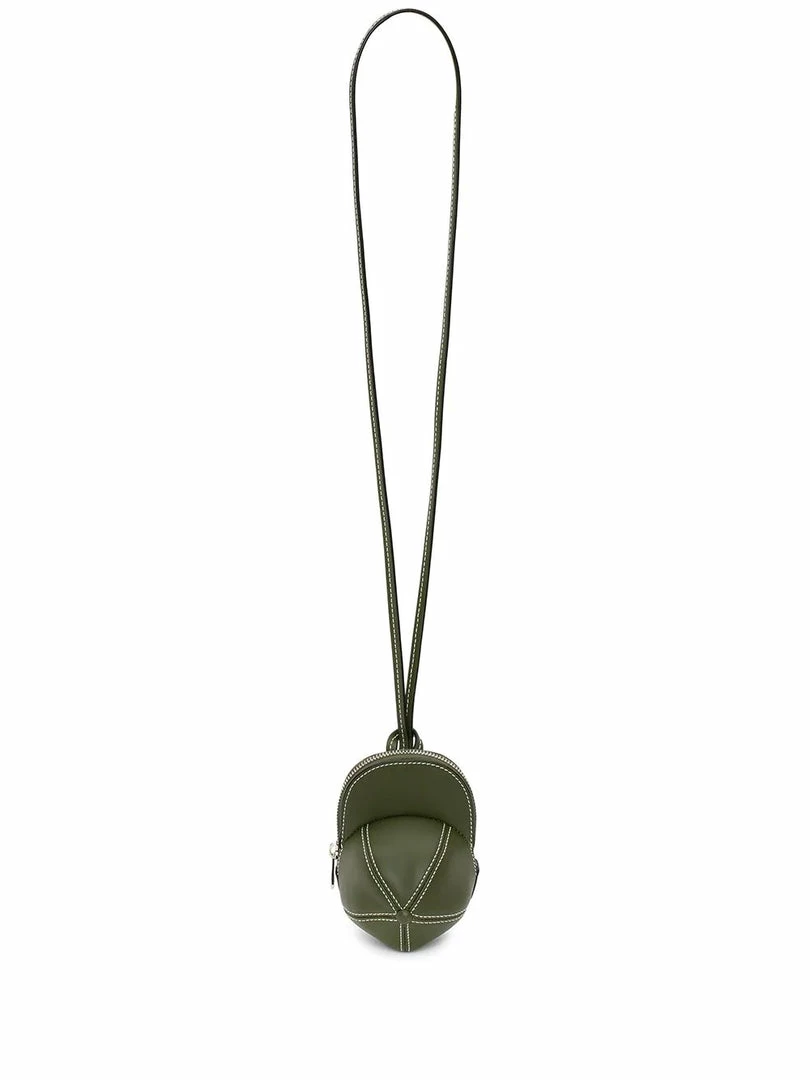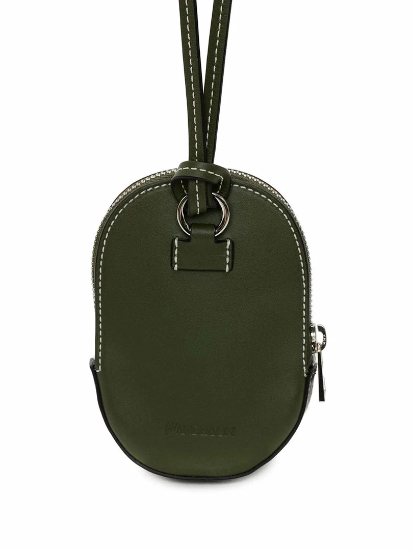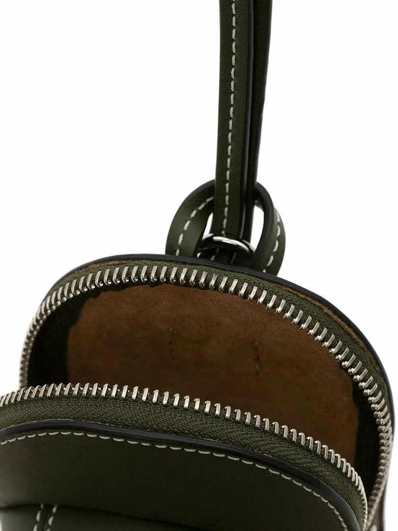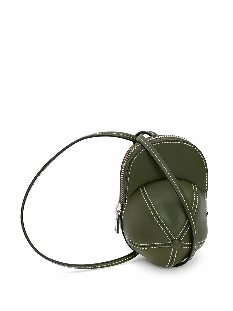 JW Anderson khaki ‘Mini Nano Cap Bag’ featuring a long shoulder or hand strap, a zip fastening, contrasting white stitching and silver tone hardware. Made in Hungary.