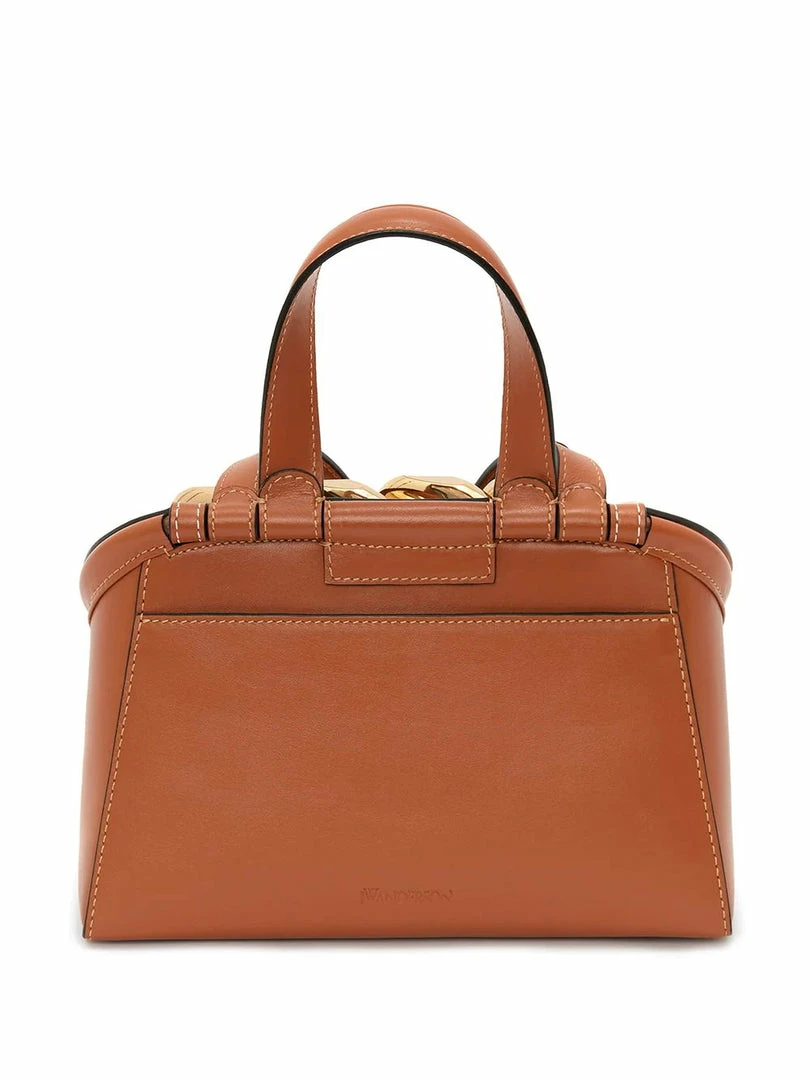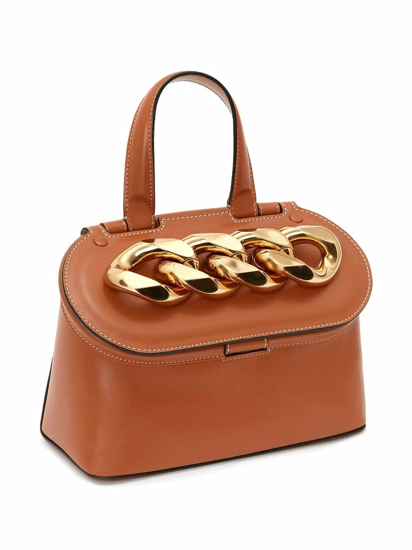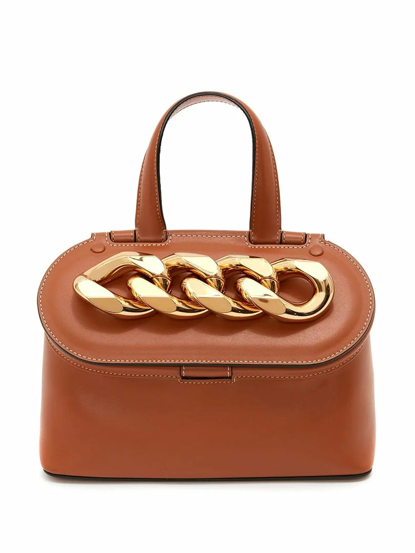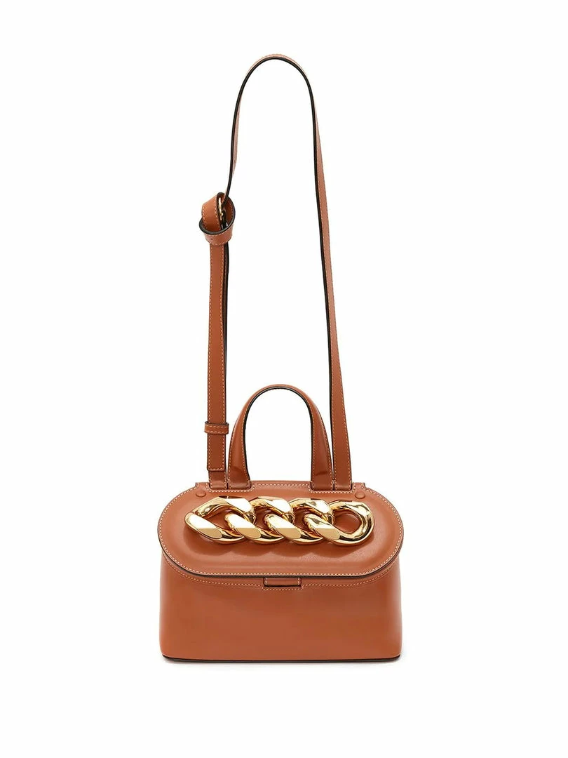 JW Anderson pecan brown ‘Small Chain Lid Bag’ featuring a top handle and an adjustable long strap, a gold tone chain detail on the front, a magnetic lid closure, an inner side slip pocket and outer back slip pocket, a brand logo embossing on the back and a soft leather finish. Made in Portugal.
