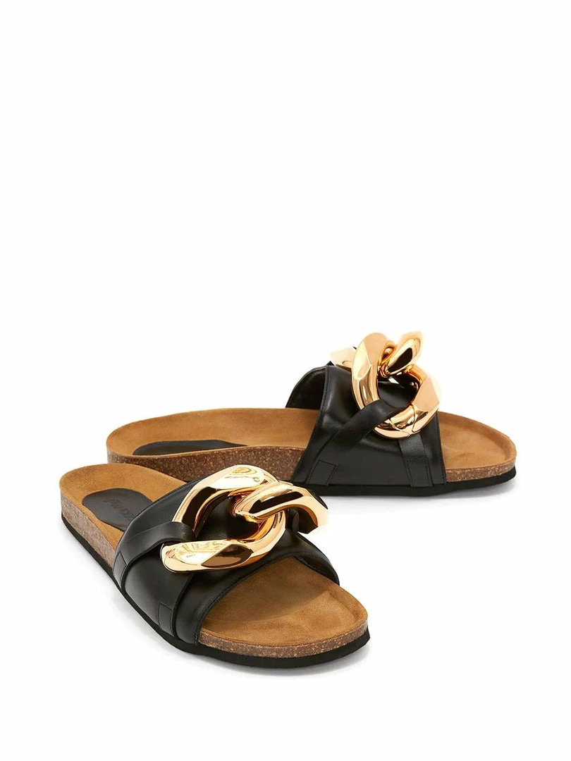 JW Anderson black ‘Leather Chain Slides’ featuring an open toe, an oversized gold tone chain detail on the front, a branded insole and a slip on style. Item fits true to size. Italian Sizing. Made in Italy.Â