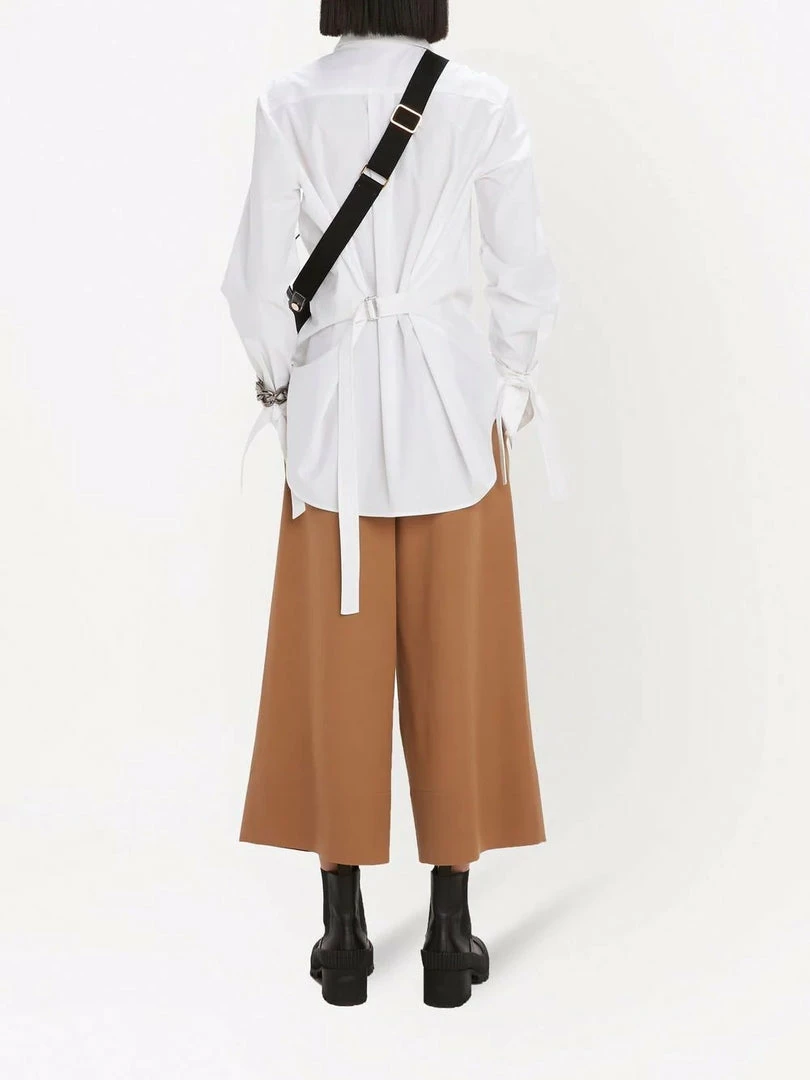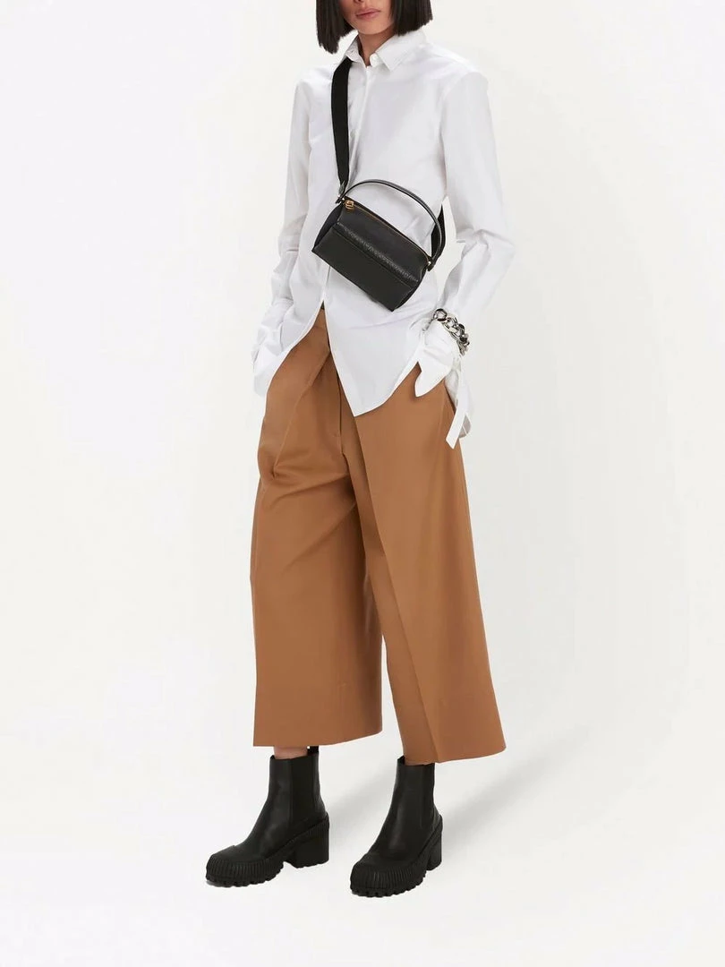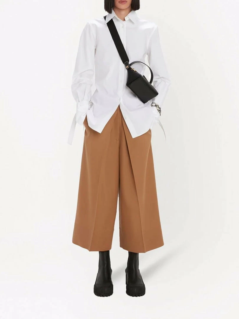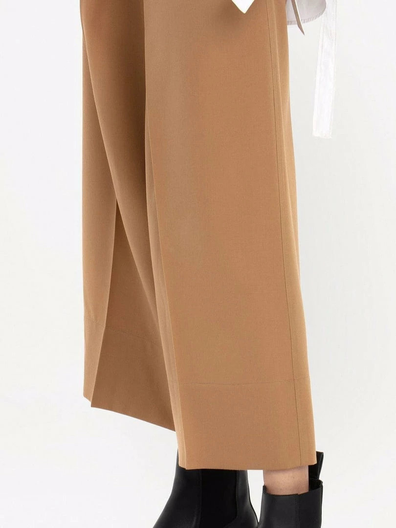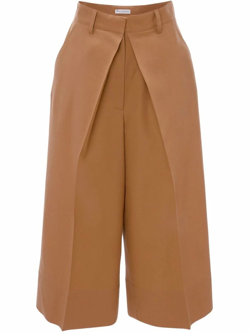 JW Anderson camel ‘Pleat Front Wide Leg Cropped Trousers’ featuring front hook, eye and zip fastenings, belt loops, a four pocket design, pleated front details, a wide leg fit and a cropped high rise style. Item fits true to size. Model is wearing a size 8 UK.