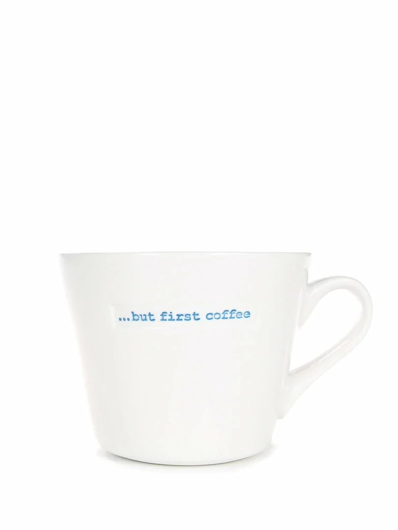 Need a caffeine fix? This Keith Brymer Jones standard bucket mug which is hand-stamped with the words ââŚbut first coffeeâ in a vibrant blue retro typewriter font. Each mug has a 350ml capacity of caffeine.