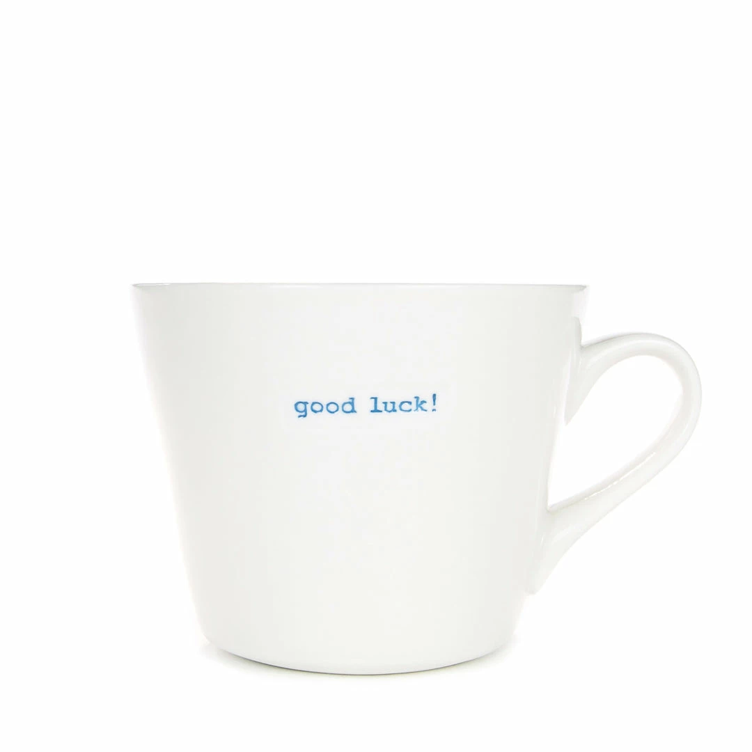 This lovely Keith Brymer Jones mug is the perfect addition to anyoneâs life. Designed right here in the UK and crafted from the finest super white porcelain this standard bucket mug has the words âgood luck!â inlaid in bright blue.