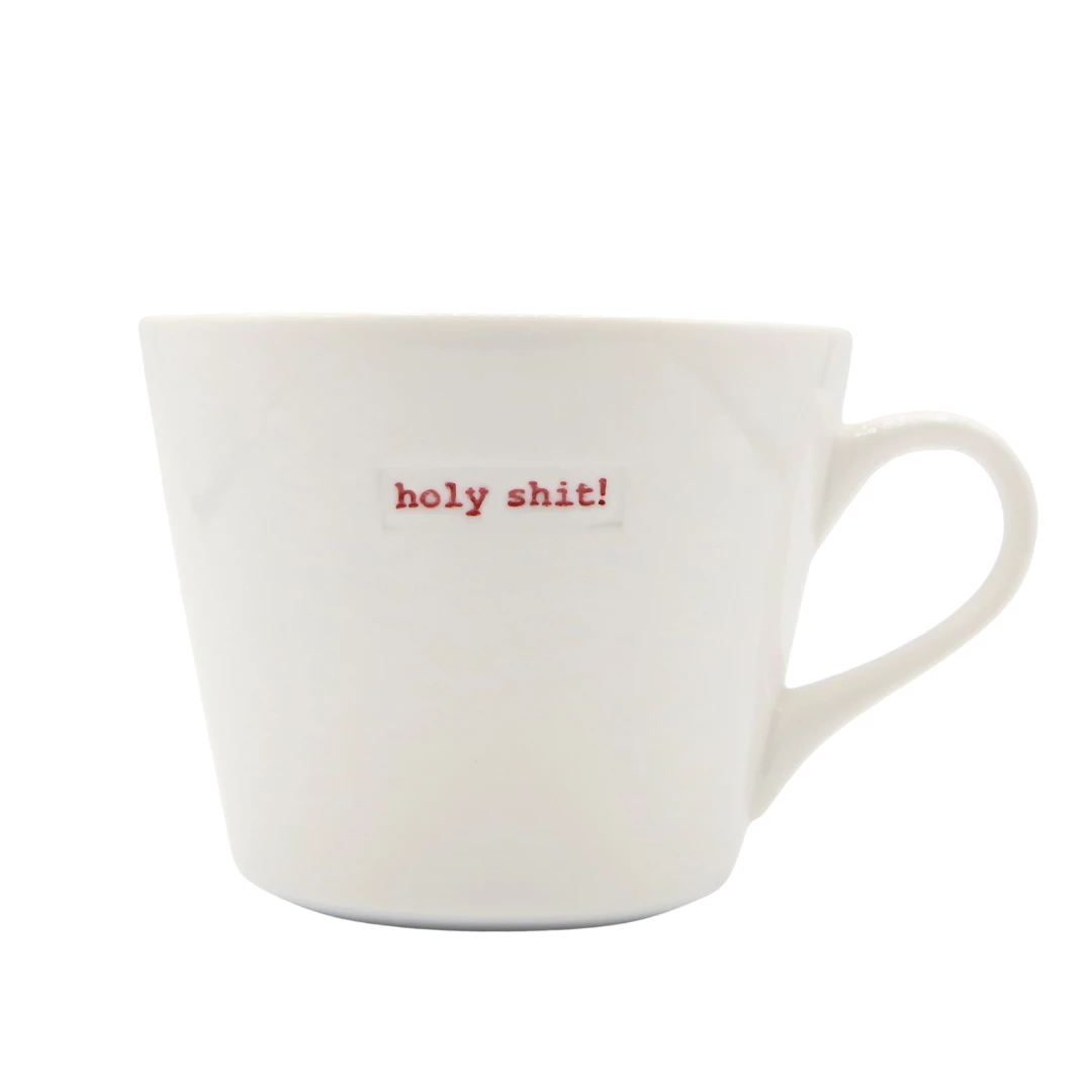 A stylish bucket mug designed by ceramicist Keith Brymer Jones. Perfectly crafted from super white porcelain & hand stamped with the words ‘Holy Shit!’. Dishwasher & microwave safe.