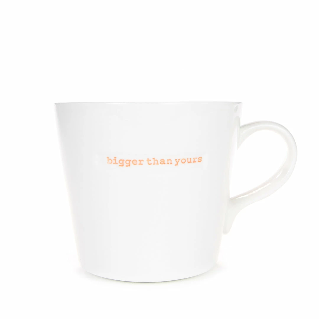Show off your massive mug of tea or coffee with the “bigger than yours” large bucket mug by Keith Brymer Jones. This mug is hand stamped using a retro type-writer font in bright orange. This mug has a capacity of 500ml.