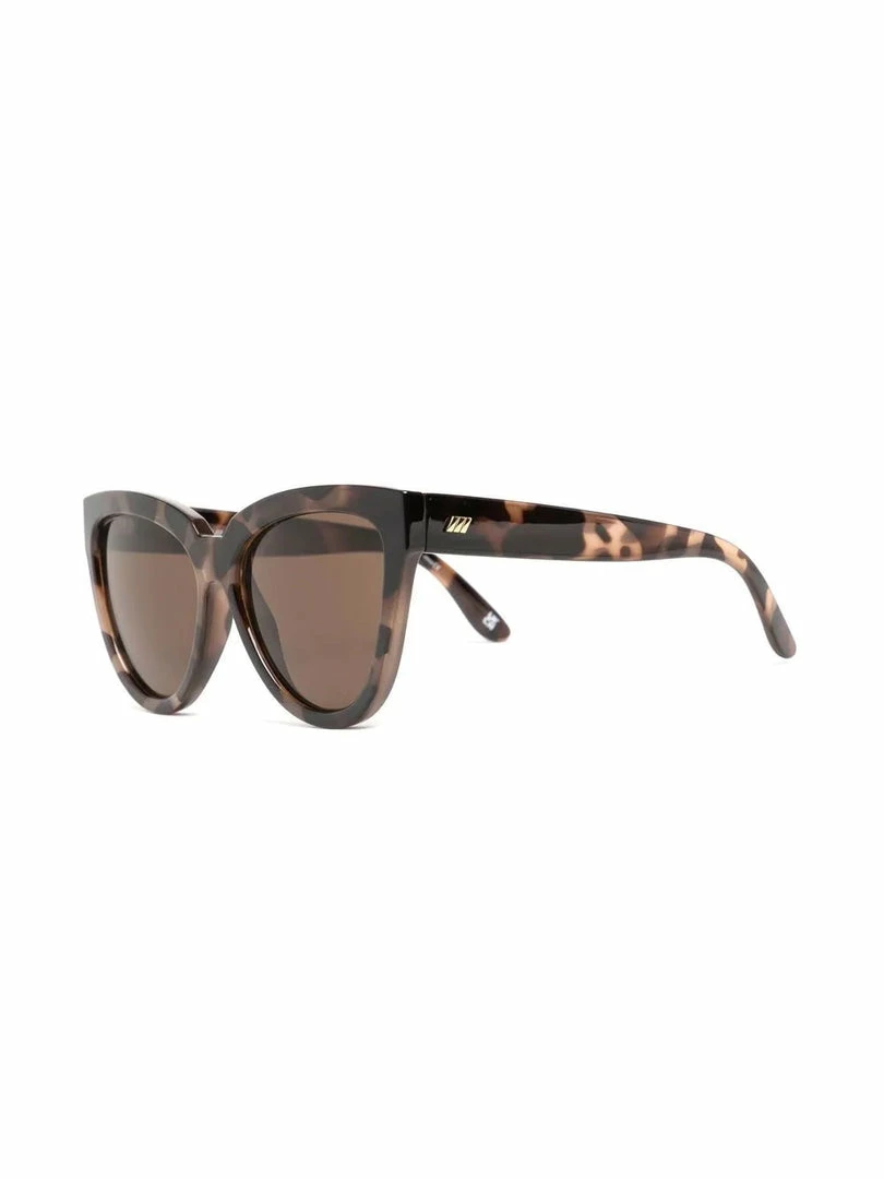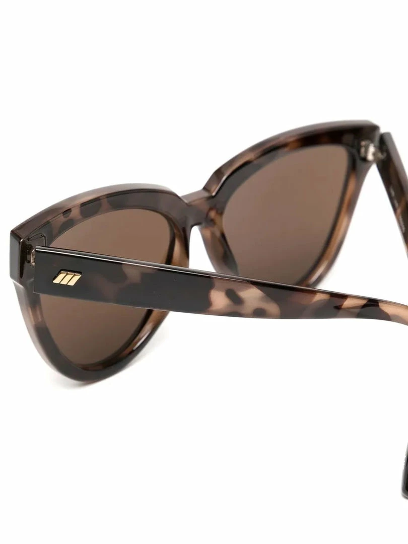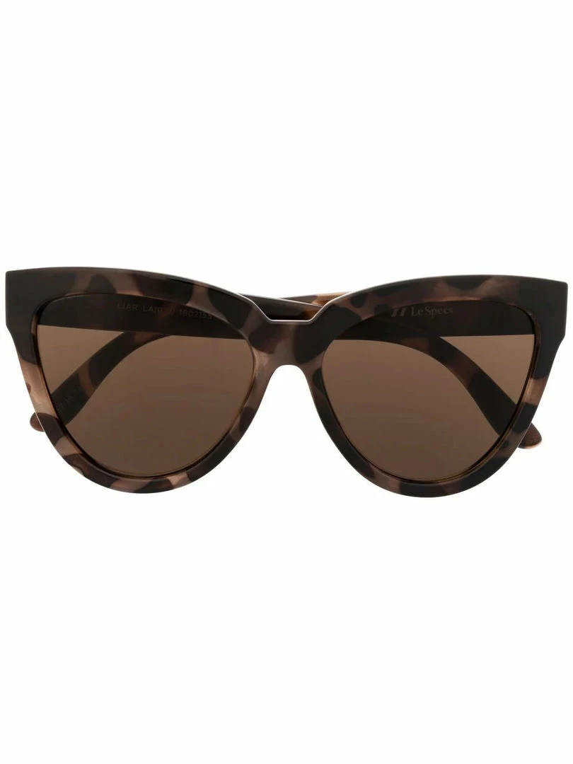 Le Specs tort ‘Liar Lair’ sunglasses featuring a tortoiseshell patterned frame, polarized lenses and a cat-eye style. These glasses come with a protective case. Made in China.