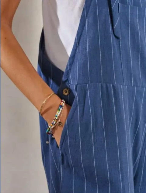 M.A.B.E blue pinstripe jumpsuit featuring adjustable tie shoulder straps, a front patch pocket, side pockets with button fastenings, a rolled up hem on the leg, a relaxed style and an oversized fit. Model is wearing a size XS.